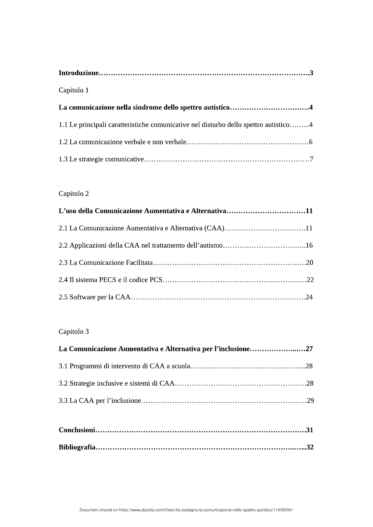 .29 Conclusioni. .31 Bibliografia .32 Document shared on https://www.docsity.com/it/tesi-tfa-sostegno-la-comunicazione-nello-spettro-autistico/11439294/.33 Sitografia. Introduzione La presente tesi si propone di esaminare i processi comunicativi che nei Disturbi dello Spettro Autistico. L'intento di questo elaborato è quello di presentare le caratteristiche e i deficit specifici nel campo della comunicazione, i quali si presentano con disturbi qualitativi dell'interazione, con compresenza di un repertorio di interessi ristretti. L'uso di strumenti di Comunicazione Aumentativa e Alternativa, con Picture Communication Symbols e supportata da software oggi a disposizione, per esempio Symwriter, rappresenta un'opportunità di gestione dei fattori esogeni e i connessi rischi di shock idiosincratico, attraverso interventi inclusivi. La scelta di studiare tale tematica è dovuta ad un forte interesse personale maturato grazie all'esperienza lavorativa. La prima parte dell'elaborato consiste in un'introduzione alle caratteristiche comunicative riscontrabili nel disturbo dello spettro autistico, passando in rassegna le possibili strategie comunicative che possono fungere da facilitatori nei processi comunicativi. Nella seconda parte del presente lavoro, invece, si valuta l'efficacia della Comunicazione Aumentativa e Alternativa per l'aumento delle competenze comunicative nei soggetti con Disturbi dello Spettro Autistico, dimostrando quanto l'adozione di strumenti e sistemi di comunicazione alternativa possano favorire un clima ecologico inclusivo, favorendo il potenziamento di forme comunicative atte ad avviare interazioni, collaborazioni, cooperazioni, attraverso azioni ed attività didattiche programmatiche. Document shared on https://www.docsity.com/it/tesi-tfa-sostegno-la-comunicazione-nello-spettro-autistico/11439294/1. La comunicazione nella sindrome dello spettro autistico 1.1 Le principali caratteristiche comunicative nel disturbo dello spettro autistico A sessant'anni dalla sua scoperta, ad opera di Bleuler (2015), il disturbo dello spettro autistico è ancora avvolto da dubbi e incertezze poiché costituisce uno dei disturbi più complessi per la vasta gamma di sintomi e deficit con i quali si manifesta; Temple Grandin lo definisce un "Continuum di caratteristiche". Quello che andremo ad analizzare con cura nel presente capitolo è il deficit della comunicazione nello spettro autistico. Alcuni studi sul disturbo dello spettro autistico descrivono lo sviluppo della comunicazione nei bambini con autismo come un processo che avviene secondo tempi e modalità differenti. Secondo Dahlgren e Gillberg, infatti, la comunicazione dei bambini con autismo già all'età di 2 anni risulta diversa rispetto a quella dei bambini a sviluppo tipico. Per quanto concerne la comunicazione, spesso si verifica un ritardo o una mancanza di sviluppo del linguaggio verbale e quando è presente, invece, si manifesta una difficoltà nel sostenere una conversazione o addirittura iniziarla e un linguaggio ristretto, ripetitivo e stereotipato. Pertanto la comunicazione può presentarsi qualitativamente danneggiata in modalità diverse: inversioni pronominali e stereotipie verbali, deficit di ricezione verbale e di produzione verbale con ecolalie1. I deficit possono manifestarsi, come in parte accennato, anche nella comunicazione non verbale: difficoltà nella comprensione e nell'uso dei gesti, mancanza di gestualità e di espressività facciale. 1 Disturbo del linguaggio consistente nella ripetizione meccanica dell'ultima parola o sillaba o parte di frase udita. Document shared on https://www.docsity.com/it/tesi-tfa-sostegno-la-comunicazione-nello-spettro-autistico/11439294/Tra le caratteristiche del linguaggio prenderemo in considerazione alcuni aspetti: articolazione, uso delle parole, ecolalia, sintassi e morfologia, comprensione del linguaggio, pragmatica. L'articolazione nei soggetti con disturbo dello spettro autistico, secondo alcuni studi, non risulta compromessa, ma si manifesta in alcuni casi un po' rallentata. Relativamente all'uso delle parole, diverse evidenze scientifiche confermano il fatto che i soggetti con autismo abbiano un linguaggio di tipo concreto. A tale proposito il test di vocabolario Peabody (Peabody Picture Vocabulary Test) dimostra che i soggetti con autismo presentano maggiori difficoltà nel riconoscimento delle parole che indicano alle emozioni. Per esempio, Tager-Flusberg (1992) dimostrò che i bambini con autismo che parteciparono a uno studio longitudinale del linguaggio, quasi non utilizzavano termini sugli stati mentali (conoscere, pensare, ricordare). L'ecolalia, immediata o differita, è un fattore predittivo dell'autismo (Kanner, 1946) che consiste nella ripetizione di parole o frasi che qualcun altro ha detto, riproducendo anche la stessa intonazione. In persone con autismo generalmente l'ecolalia si manifesta quando il linguaggio espressivo è minimo (McEvoy, Loveland, y Landry,1988). Anche se l'ecolalia può essere un fattore predittivo dello spettro autistico, non sempre si manifesta nei soggetti con autismo. Relativamente alla sintassi e la morfologia, alcune ricerche (Bartolucci, Pierce, y Streiner, 1980. Bartolucci et al.) dimostrano che i bambini con autismo sono più propensi a omettere articoli, verbi ausiliari, terza persona e tempo passato. Le ricerche sulla comprensione del linguaggio dei soggetti con autismo, invece, risultano meno numerose rispetto agli studi sulla produzione del linguaggio. Charman et al. (2003) hanno condotto delle ricerche in merito e hanno rilevato che la comprensione è un processo che avviene più tardi rispetto alla produzione delle parole. La maggior parte dei deficit linguistici che è possibile riscontrare nei soggetti con autismo sono di ordine pragmatico; ovvero difficoltà persistenti nell'uso sociale della comunicazione. A tale proposito Baron-Cohen dichiarava che "I bambini autistici usano il linguaggio strumentalmente, ma non com