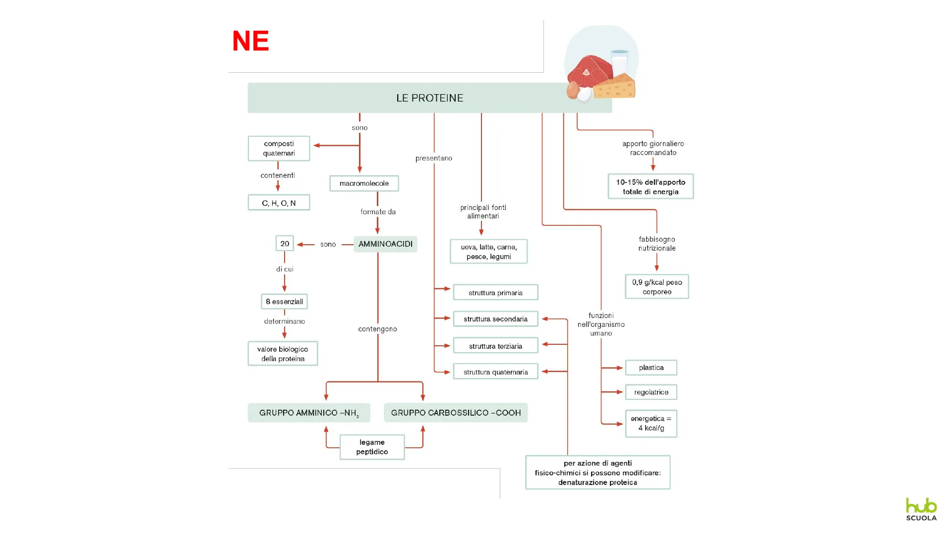 PROTEINE Sono composti quaternari; sono formate da quattro elementi: carbonio (C), idrogeno (H), ossigeno (O) e azoto (N), ma possono contenere anche zolfo (S) o fosforo (P). hub SCUOLAPag. 120/3