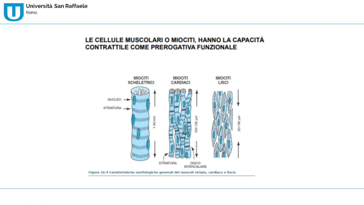 NUCLEO STRIATURA 1-40 mm 100-120 pm 20-130 jam - STRIATURA DISCO INTERCALARE Figura 26.4 Caratteristiche morfologiche generali dei muscoli striato, cardiaco e liscio
