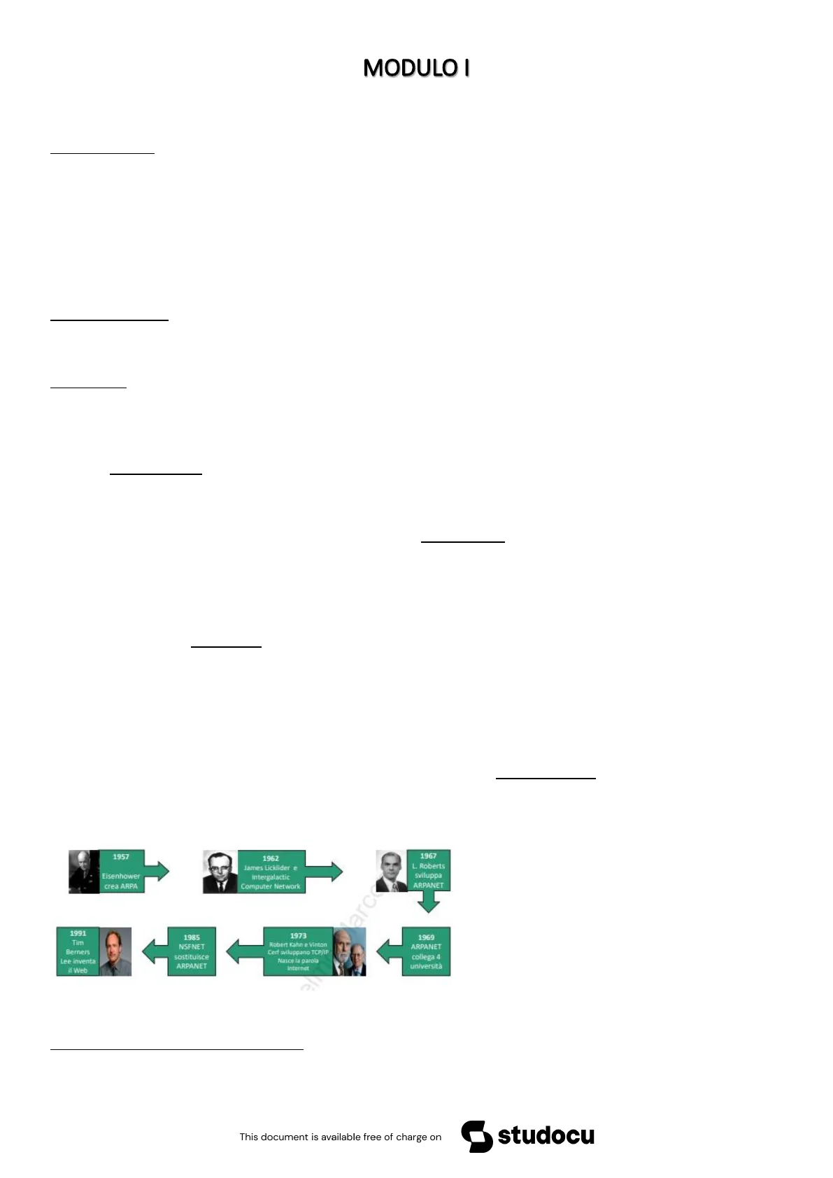 Nel 1957 in piena guerra fredda l'URSS lancia il primo satellite nello spazio (sputnik) creando pressioni da parte dell'opinione pubblica americana verso lo stato affinchè si recuperasse questo divario alla "corsa allo spazio" quindi Eisenhower crea un'agenzia: ARPA che metteva in relazione più alte competenze differenti presenti negli stati uniti ( con ingegneri e psicologi nonché futuri informatici) e metterle in comunicazione tra loro per avanzare tecnologicamente e fare progetti che permettessero di competere con gli avanzamenti tecnologici che l'URSS stava facendo. Nel 1962 James Licklider, psicologo che lavorava nell'ARPA teorizza il concetto di INC (intergalatic computer network) una piccola rete pensata per permettere a tutti gli studiosi di accedere a una conoscenza legata non solo al posto fisico come la biblioteca ma anche a documenti presenti in luoghi diversi. Nel 1967 Arpa si struttura in maniera più articolata grazie a Lerry Roberts che sviluppa ARPANET mettendo in pratica il progetto di JL, ovvero una rete di computer che comunicavano tra loro arrivando nel 1969 a collegare 4 università negli USA, nel 1973 si riesce a collegare questa rete alla rete che si stava lentamente sviluppando in Europa nell'ambito universitario. Rimaneva il problema di far comunicare computer con hardwer e strutture diverse tra loro ( reti non omogene) ma due ingegneri di ARPA kahn e Cerf ,risolvono il problema creando il protocollo TCP/IP ovvero un insieme di pacchetti in informazioni la cui decriptazione è possibile da tutti i computer che avesse installato un softwer che potesse decriptare questi pacchetti, TCP (modalità attraverso le quali i dati viaggiano nella rete.) IP (definisce come quei dati devono giungere ai dispositivi che ne fanno richiesta e come da questi devono essere interpretati). Contemporaneamente nasce la parola internet ovvero una rete capace di connettersi in maniera dinamica e connettere ad essa diverse macchine con caratteristiche diverse. L'evoluzione di questo progetto avviene nel 1985 quando l'NSFNET sostituisce definitivamente l'ARPANET (che verrà utilizzata per fini militari dal governo) e nel 1991 viene creato il web da Tim Berners Lee che intuisce che si potesse utilizzare un'infrastruttura già presente a livello globale ovvero la rete telefonica, la quale permetteva di mettere in relazione non solo i computer delle istituzioni ma qualunque Pc in grado di connettersi alla rete telefonica attraverso un modem.