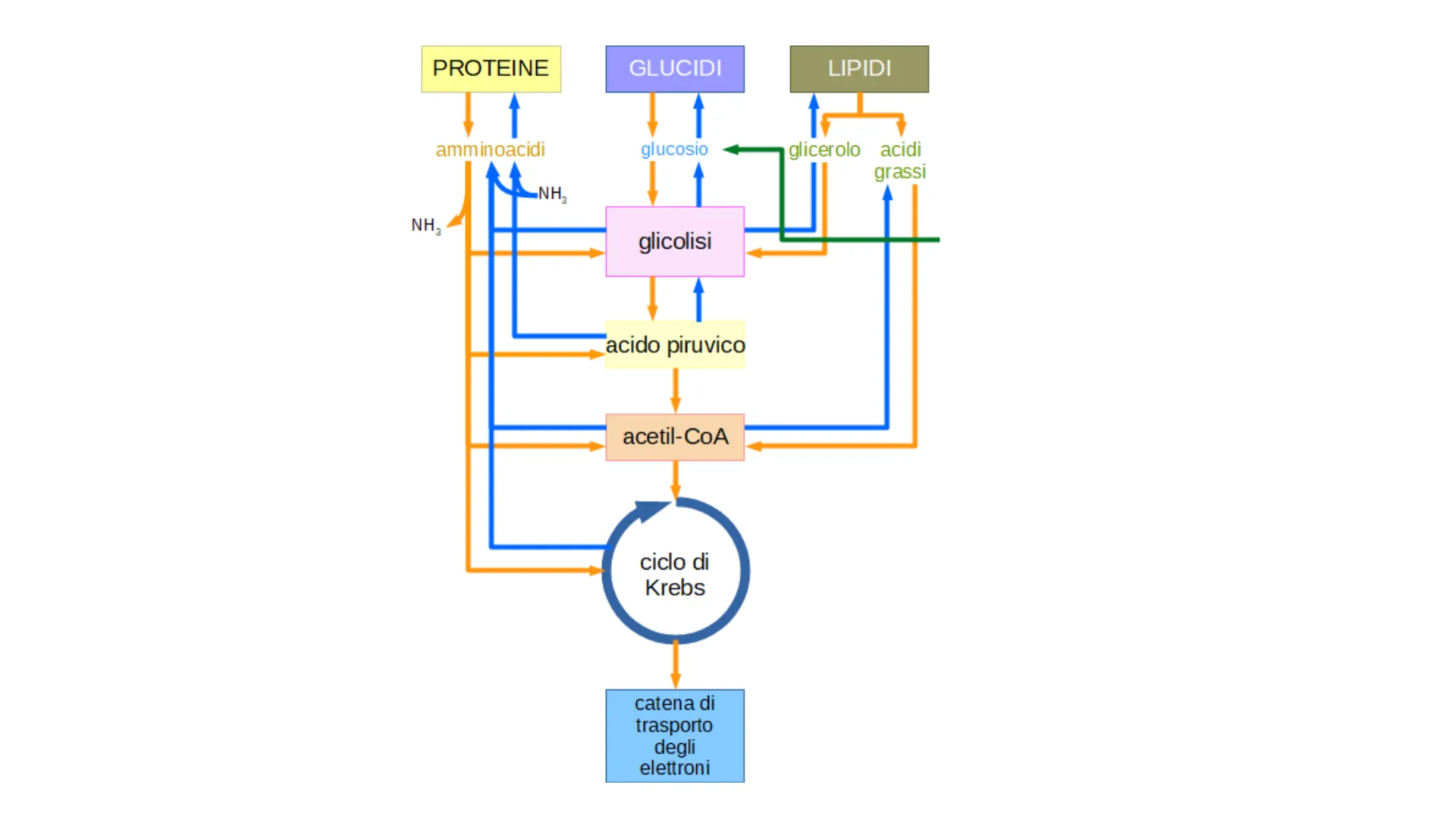 PROTEINE GLUCIDI LIPIDI amminoacidi glucosio glicerolo acidi grassi NH2 NH glicolisi acido piruvico acetil-CoA ciclo di Krebs catena di trasporto degli elettroni