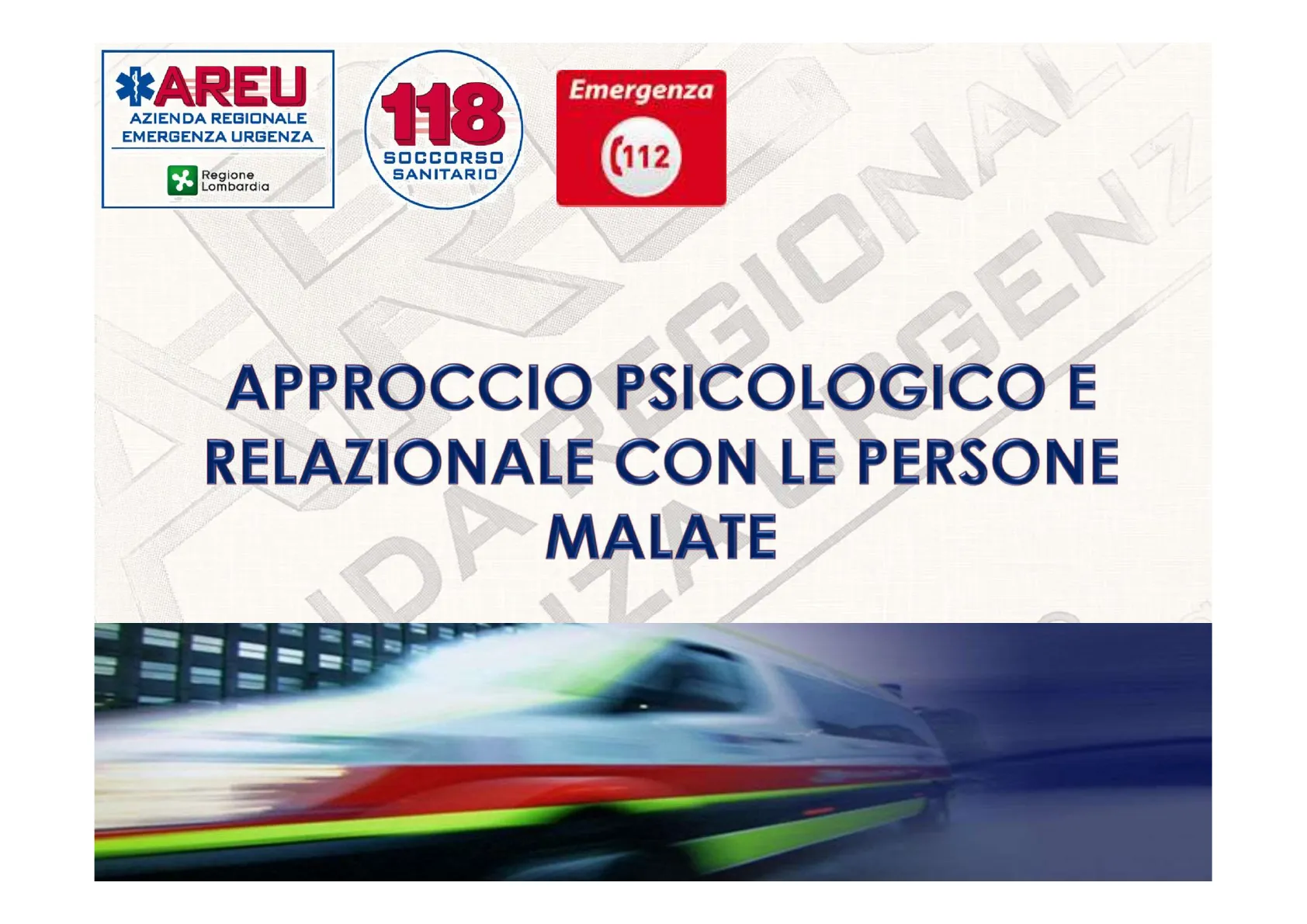 Slide da Areu Azienda Regionale Emergenza Urgenza Regione Lombardia su Approccio Psicologico e Relazionale con le Persone Malate. Il Pdf esplora i disturbi d'ansia, gli attacchi di panico e le crisi isteriche, fornendo strumenti per comunicare efficacemente con i pazienti. Questo materiale di Formazione professionale in Psicologia è utile per lo studio autonomo.