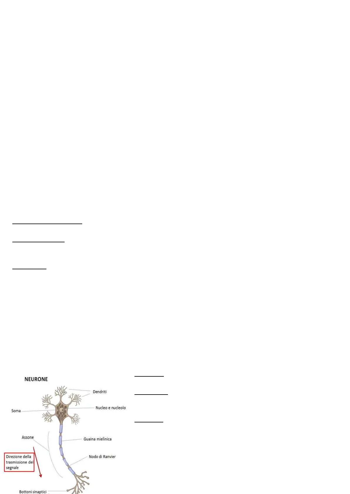 NEURONE Dendriti Nucleo e nucleolo Soma Assone Guaina mielinica Nodo di Ranvier Direzione della trasmissione del segnale Bottoni sinaptici FUNZIONE: I neuroni hanno la funzione di comunicare e quindi ricevono e trasmettono informazioni. STRUTTURA: Per svolgere questa funzione i neuroni dispongono di: - una parte che riceve informazioni: Input; - una parte che trasmette informazioni: Output CONTIENE: - Nucleo con il materiale genetico; - Mitocondri producono energia; -Reticolo endoplasmatico serve a produrre proteine necessarie al funzionamento cellulare e i mediatori chimici; -I dendriti: ramificazioni del neurone che servono alla ricezione dei segnali provenienti da altri neuroni; -L'assone: singolo prolungamento del neurone che origina dal soma, serve a trasmettere il segnale nervoso dal corpo cellulare verso i terminali assonali.Molti assoni sono ricoperti da una guaina mielinica la cui presenza aumenta la velocità di propagazione dell'impulso nervoso. La guaina mielinica si interrompe ad intervalli regolari (nodi di Ranvier). I neuroni ricevono e trasmettono informazioni sotto forma di impulsi nervosi, i quali si propagano attraverso il neurone, dai dendriti o dal corpo cellulare fino all'estremità dell'assone.