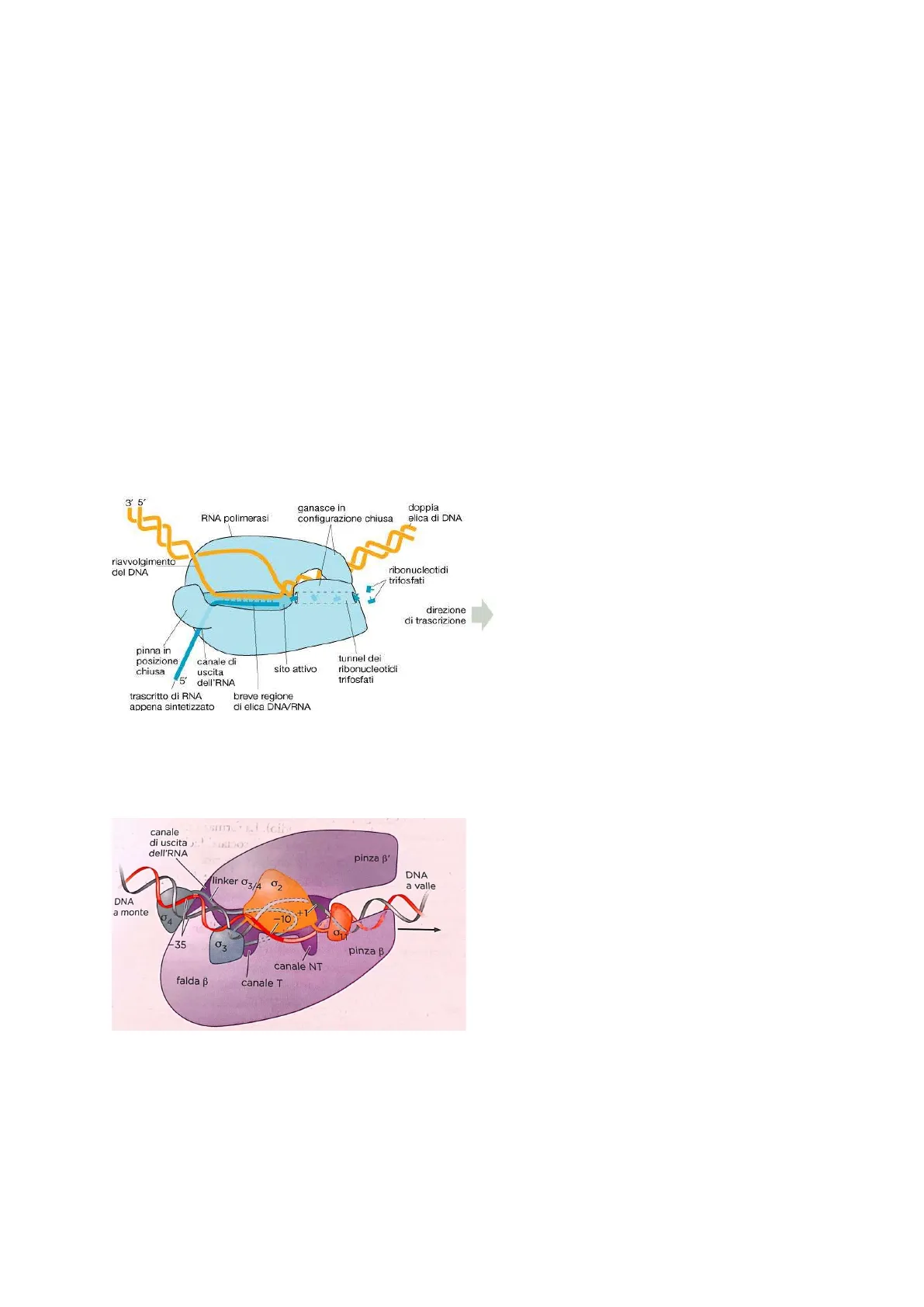 canale di uscita dell'RNA Le due componenti della chela (subunità beta pinza B' e beta 1) stabilizzano il DNA in entrata e poi K linker 03/4 º2 DNA a valle DNA a monte avremmo un canale centrale (NTP-uptake) che permette l'entrata dei riboNTP , questi 04 03 canale NT verranno avvicinati per la formazione del -35 -10 legame fosfodiesterico con conseguente pinza ₿ uscita del pirofosfato. Nel sito attivo non ci falda ß canale T saranno due magnesi ma uno solo che contribuisce alla catalisi fosfodiesterica. All'interno del canale centrale i filamenti di DNA si allontanano dalla posizione + 3. Il filamento che non fa da stampo esce attraverso il canale NT (nontemplate) e si sposta lungo la superficie dell'enzima. Il filamento stampo, invece, segue un percorso lungo il canale centrale ed esce attraverso il canale T (template). La doppia elica si riforma in posizione - 11 nel DNA a monte, cioè dietro l'enzima. Poi c'è la componente del canale centrale che permette la fuoriuscita del RNA neo-formato. RNA neo-formato e DNA stanno tra loro a 90°.