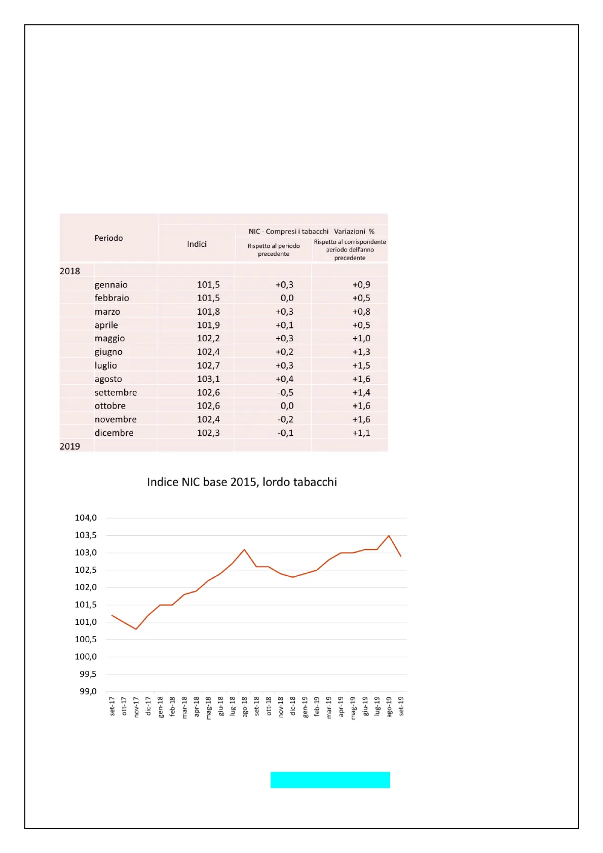 Periodo Indici Rispetto al periodo precedente Rispetto al corrispondente periodo dell'anno precedente 2018 gennaio 101,5 +0,3 +0,9 febbraio 101,5 0,0 +0,5 marzo 101,8 +0,3 +0,8 aprile 101,9 +0,1 +0,5 maggio 102,2 +0,3 +1,0 giugno 102,4 +0,2 +1,3 luglio 102,7 +0,3 +1,5 agosto 103,1 +0,4 +1,6 settembre 102,6 -0,5 +1,4 ottobre 102,6 0,0 +1,6 novembre 102,4 -0,2 +1,6 dicembre 102,3 -0,1 +1,1 2019 Indice NIC base 2015, lordo tabacchi 104,0 103,5 103,0 102,5 102,0 101,5 101,0 100,5 100,0 99,5 99,0 set-17 ott-17 nov-17 dic-17 gen-18 feb-18 mar-18 apr-18 mag-18 giu-18 lug-18 ago-18 set-18 ott-18 nov-18 dic-18 gen-19 feb-19 mar-19 apr-19 mag-19 giu-19 lug-19 ago-19 set-19