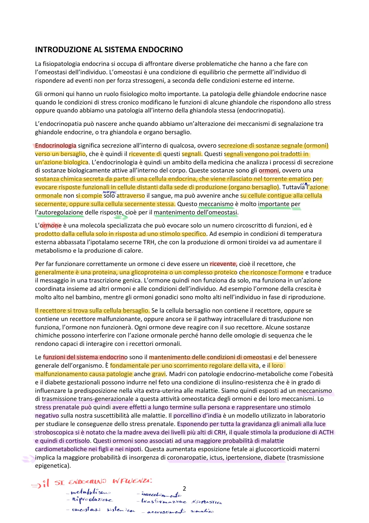 La fisiopatologia endocrina si occupa di affrontare diverse problematiche che hanno a che fare con l'omeostasi dell'individuo. L'omeostasi è una condizione di equilibrio che permette all'individuo di rispondere ad eventi non per forza stressogeni, a seconda delle condizioni esterne ed interne. Gli ormoni qui hanno un ruolo fisiologico molto importante. La patologia delle ghiandole endocrine nasce quando le condizioni di stress cronico modificano le funzioni di alcune ghiandole che rispondono allo stress oppure quando abbiamo una patologia all'interno della ghiandola stessa (endocrinopatia). L'endocrinopatia può nascere anche quando abbiamo un'alterazione dei meccanismi di segnalazione tra ghiandole endocrine, o tra ghiandola e organo bersaglio. Endocrinologia significa secrezione all'interno di qualcosa, ovvero secrezione di sostanze segnale (ormoni) verso un bersaglio, che è quindi il ricevente di questi segnali. Questi segnali vengono poi tradotti in un'azione biologica. L'endocrinologia è quindi un ambito della medicina che analizza i processi di secrezione di sostanze biologicamente attive all'interno del corpo. Queste sostanze sono gli ormoni, ovvero una sostanza chimica secreta da parte di una cellula endocrina, che viene rilasciato nel torrente ematico per evocare risposte funzionali in cellule distanti dalla sede di produzione (organo bersaglio). Tuttavia l'azione ANCHE ormonale non si compie solo attraverso il sangue, ma può avvenire anche su cellule contigue alla cellula secernente, oppure sulla cellula secernente stessa. Questo meccanismo è molto importante per l'autoregolazione delle risposte, cioè per il mantenimento dell'omeostasi. L'ormone è una molecola specializzata che può evocare solo un numero circoscritto di funzioni, ed è prodotto dalla cellula solo in risposta ad uno stimolo specifico. Ad esempio in condizioni di temperatura esterna abbassata l'ipotalamo secerne TRH, che con la produzione di ormoni tiroidei va ad aumentare il metabolismo e la produzione di calore. Per far funzionare correttamente un ormone ci deve essere un ricevente, cioè il recettore, che generalmente è una proteina, una glicoproteina o un complesso proteico che riconosce l'ormone e traduce il messaggio in una trascrizione genica. L'ormone quindi non funziona da solo, ma funziona in un'azione coordinata insieme ad altri ormoni e alle condizioni dell'individuo. Ad esempio l'ormone della crescita è molto alto nel bambino, mentre gli ormoni gonadici sono molto alti nell'individuo in fase di riproduzione. Il recettore si trova sulla cellula bersaglio. Se la cellula bersaglio non contiene il recettore, oppure se contiene un recettore malfunzionante, oppure ancora se il pathway intracellulare di trasduzione non funziona, l'ormone non funzionerà. Ogni ormone deve reagire con il suo recettore. Alcune sostanze chimiche possono interferire con l'azione ormonale perché hanno delle omologie di sequenza che le rendono capaci di interagire con i recettori ormonali. Le funzioni del sistema endocrino sono il mantenimento delle condizioni di omeostasi e del benessere generale dell'organismo. È fondamentale per uno scorrimento regolare della vita, e il loro malfunzionamento causa patologie anche gravi. Madri con patologie endocrino-metaboliche come l'obesità e il diabete gestazionali possono indurre nel feto una condizione di insulino-resistenza che è in grado di influenzare la predisposizione nella vita extra-uterina alle malattie. Siamo quindi esposti ad un meccanismo di trasmissione trans-generazionale a questa attività omeostatica degli ormoni e dei loro meccanismi. Lo stress prenatale può quindi avere effetti a lungo termine sulla persona e rappresentare uno stimolo negativo sulla nostra suscettibilità alle malattie. Il porcellino d'india è un modello utilizzato in laboratorio per studiare le conseguenze dello stress prenatale. Esponendo per tutta la gravidanza gli animali alla luce stroboscopica si è notato che la madre aveva dei livelli più alti di CRH, il quale stimola la produzione di ACTH e quindi di cortisolo. Questi ormoni sono associati ad una maggiore probabilità di malattie cardiometaboliche nei figli e nei nipoti. Questa aumentata esposizione fetale ai glucocorticoidi materni implica la maggiore probabilità di insorgenza di coronaropatie, ictus, ipertensione, diabete (trasmissione epigenetica).