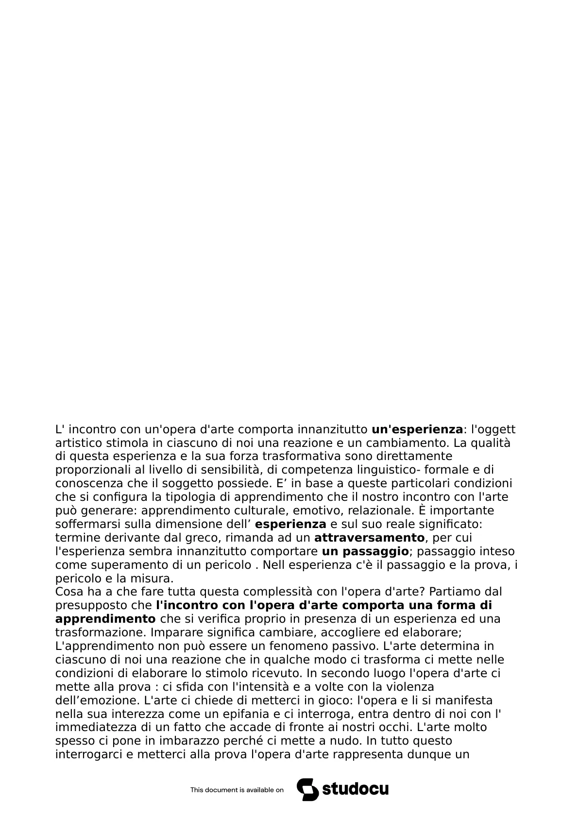 L'incontro con un'opera d'arte comporta innanzitutto un'esperienza: l'oggetto artistico stimola in ciascuno di noi una reazione e un cambiamento. La qualità di questa esperienza e la sua forza trasformativa sono direttamente proporzionali al livello di sensibilità, di competenza linguistico- formale e di conoscenza che il soggetto possiede. E' in base a queste particolari condizioni che si configura la tipologia di apprendimento che il nostro incontro con l'arte può generare: apprendimento culturale, emotivo, relazionale. È importante soffermarsi sulla dimensione dell' esperienza e sul suo reale significato: termine derivante dal greco, rimanda ad un attraversamento, per cui l'esperienza sembra innanzitutto comportare un passaggio; passaggio inteso come superamento di un pericolo . Nell esperienza c'è il passaggio e la prova, il pericolo e la misura.