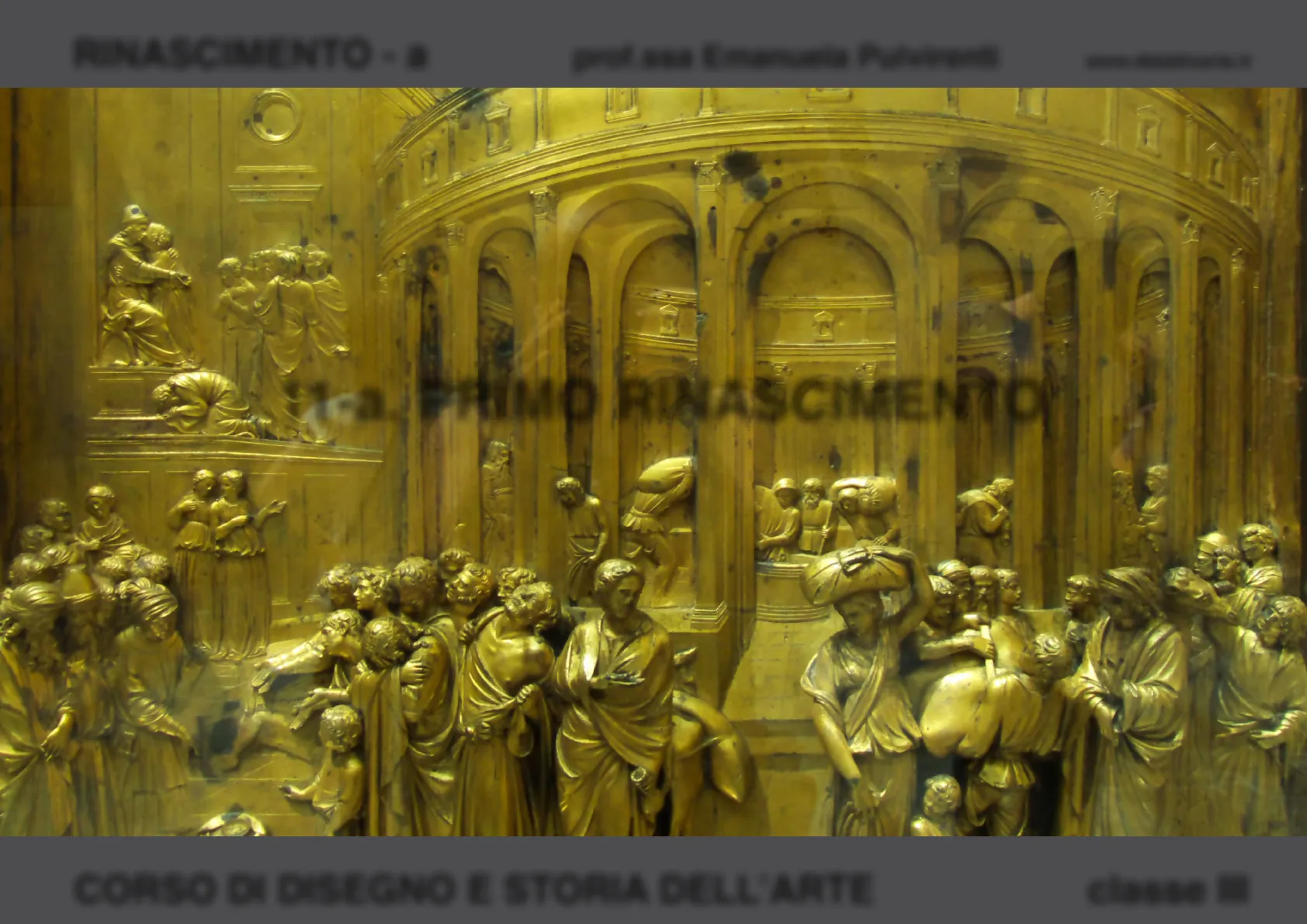 prof.ssa Emanuela Pulvirenti www.didatticarte.it Nella Flagellazione e nella Crocifissione la compostezza classica è ancora più scoperta: nella prima la figura di Cristo sfrutta la ponderazione per assumere un andamento sinuo- samente raffinato che si rapporta alle pose simmetriche dei flagellatori. Nella seconda la croce segna l'asse verticale di una composizione piramidale. Nella Disputa coi dottori il movimento dei drappeggi è già un capolavoro mentre la pro- spettiva approfondisce lo spazio narrativo. La doratura, risaltando sul fondo scuro del bronzo, esalta la linea e l'eleganza dei sog- getti. Gli ambienti in cui si svolgono le scene sono appena accennati da rocce o elementi architettonici.