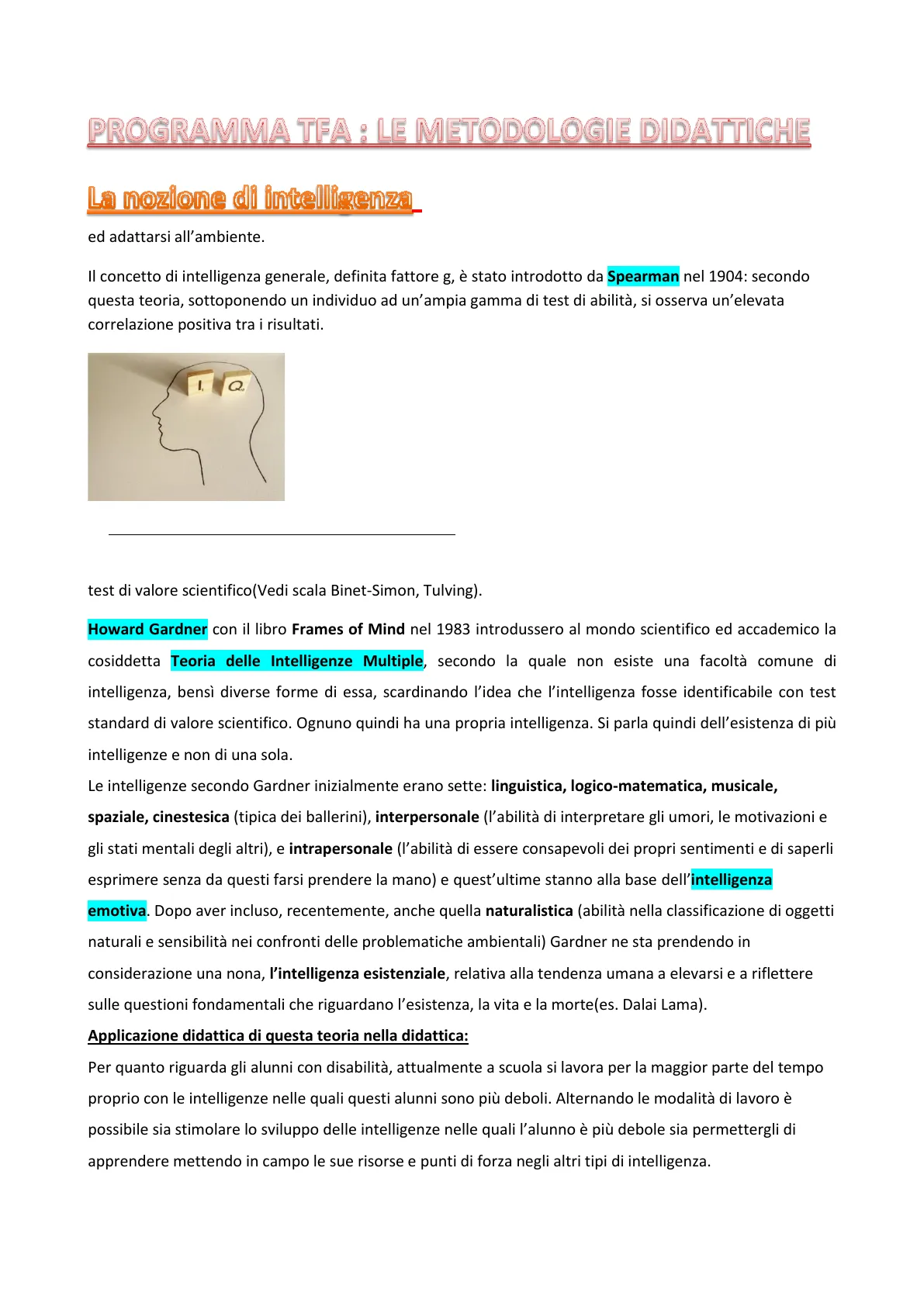 Documento universitario sulle metodologie didattiche del programma TFA. Il Pdf esplora le teorie dell'intelligenza di Gardner e Sternberg, applicandole alla didattica inclusiva, cooperative learning, peer education e flipped classroom, con un focus sul compito di realtà.