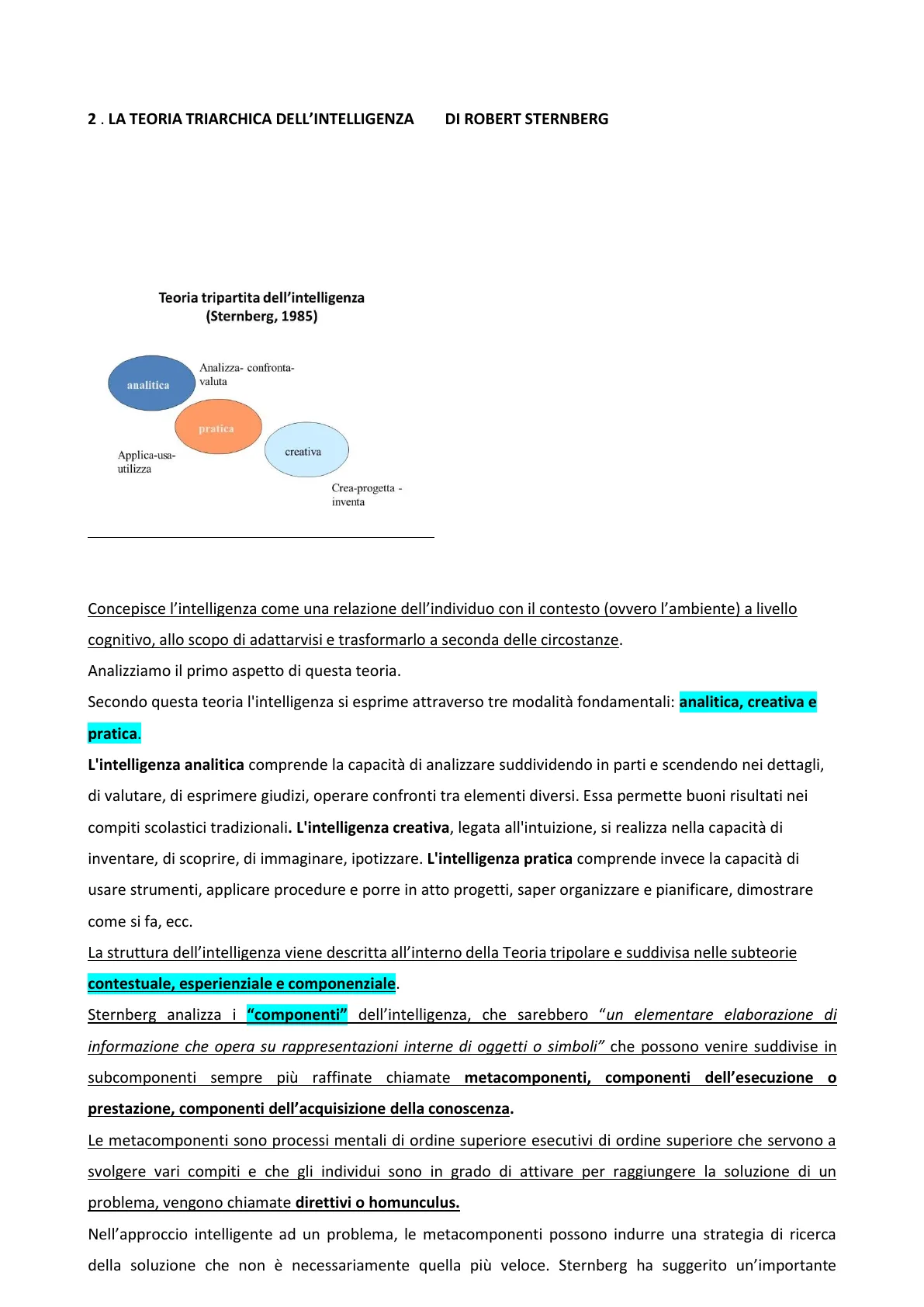 L'intelligenza analitica comprende la capacità di analizzare suddividendo in parti e scendendo nei dettagli, di valutare, di esprimere giudizi, operare confronti tra elementi diversi. Essa permette buoni risultati nei compiti scolastici tradizionali. L'intelligenza creativa, legata all'intuizione, si realizza nella capacità di inventare, di scoprire, di immaginare, ipotizzare. L'intelligenza pratica comprende invece la capacità di usare strumenti, applicare procedure e porre in atto progetti, saper organizzare e pianificare, dimostrare come si fa, ecc.