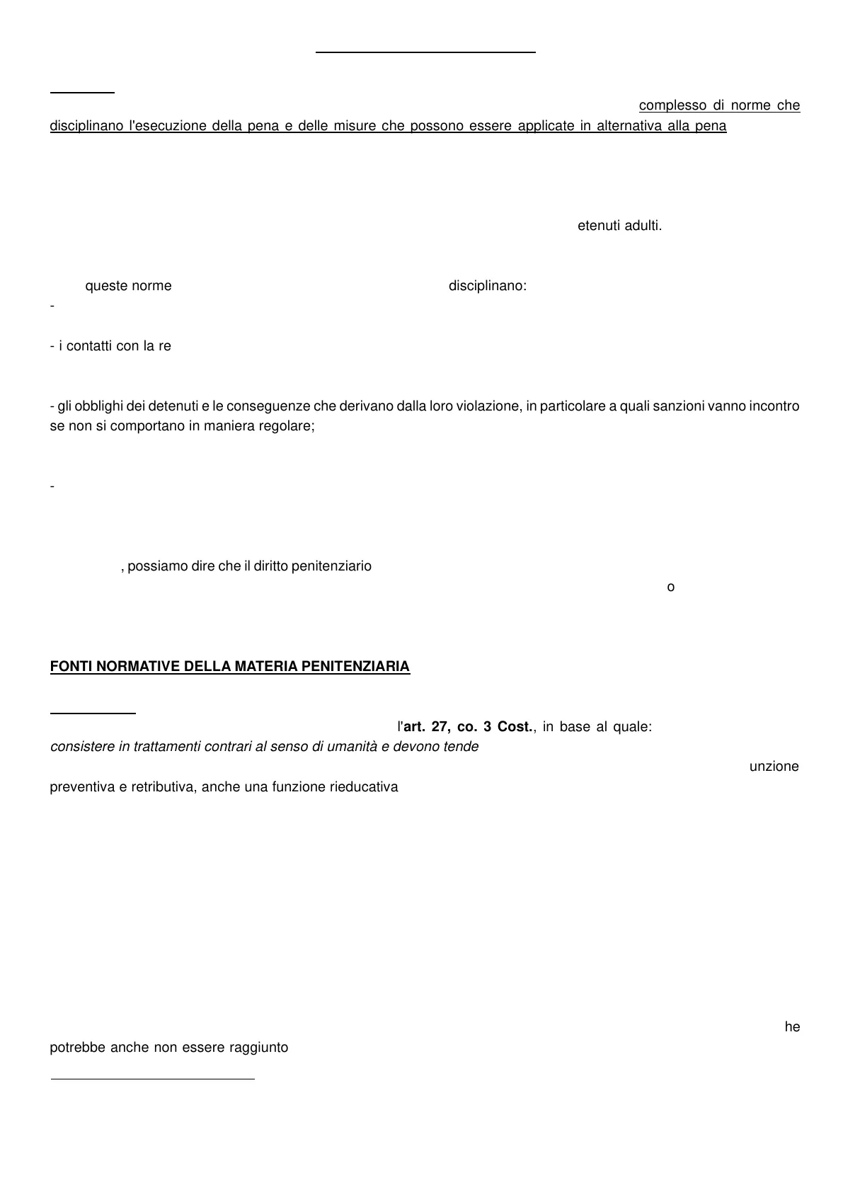 a) Rappresenta fonte interna di massima importanza l'art. 27, co. 3 Cost., in base al quale: "le pene non possono consistere in trattamenti contrari al senso di umanità e devono tendere alla rieducazione del condannato". Si tratta di una norma che sancisce un principio di estremo valore, riconoscendo alla pena, oltre ad una funzione preventiva e retributiva, anche una funzione rieducativa: a) funzione retributiva -> la pena serve a compensare il danno provocato mediante una afflizione, una punizione proporzionata ad esso; b) funzione general-preventiva (anche detta "di prevenzione generale") -> la pena serve a indurre tutte le persone a rispettare la legge, perchè l'applicazione della pena al condannato rappresenta un deterrente per tutti gli altri; c) funzione special-preventiva (anche detta "di prevenzione speciale") -> la pena serve ad evitare che il reo torni a violare la legge penale. Quest'ultima funzione può realizzarsi in due modi diversi: mediante la neutralizzazione del reo (tipico esempio è l'esecuzione della pena in carcere) e mediante la risocializzazione/rieducazione del condannato1. L'art. 27, co. 3 Cost. impone a tutti gli operatori penitenziari di tendere alla risocializzazione dei condannati, cioè di far loro comprendere i valori offesi e quelli fondamentali su cui si basa la vita sociale, di prepararli ad un ritorno in società dove potranno evitare la reiterazione di condotte criminose. Lo scopo della rieducazione, cioè, è quello di far evolvere la personalità dei detenuti verso modelli socialmente validi, di indurre i detenuti a revisionare le motivazioni che li hanno condotti verso scelte criminali. NB: la Costituzione utilizza il verbo "tendere" -> significa che quello della risocializzazione è un obiettivo cui si tende, che potrebbe anche non essere raggiunto: molto dipende dalla adesione del detenuto al trattamento rieducativo che viene 1Come vedremo, l'attuazione della funzione rieducativa è affidata alle attività trattamentali organizzate negli istituti di pena, ai benefici penitenziari e alle misure alternative alla detenzione. Marta F. Tarallopensato per lui, dalla sua disponibilità a collaborare e ad aderire alle attività rieducative organizzate dall'istituto penitenziario. Inoltre, il termine "rieducazione" non deve essere inteso come "pentimento interiore" -> viviamo in uno Stato democratico di diritto in cui quello che si può fare è "semplicemente" insegnare il rispetto dei valori fondamentali della vita sociale.