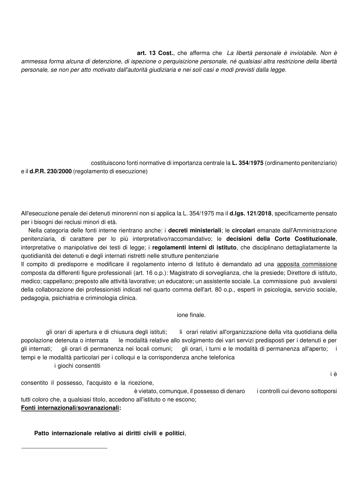 Fonti internazionali/sovranazionali: Queste fonti si caratterizzano per essere firmate da più Stati, che si vincolano a rispettarle, e sono accomunate dalla volontà di proteggere i diritti fondamentali delle persone, la loro libertà e la loro dignità. Le principali sono: a) il Patto internazionale relativo ai diritti civili e politici, approvato dalle Nazioni Unite (ONU) nel 1966 (art. 7: 2Gli oggetti che il detenuto non può tenere con sé sono ritirati dalla direzione, che li mette in un deposito per poi restituirli all'atto della dimissione. Se si tratta di oggetti ingombranti che non possono essere tenuti in magazzino, sono consegnati ai familiari durante i colloqui o spediti agli stessi a spese del detenuto. Marta F. Tarallo
