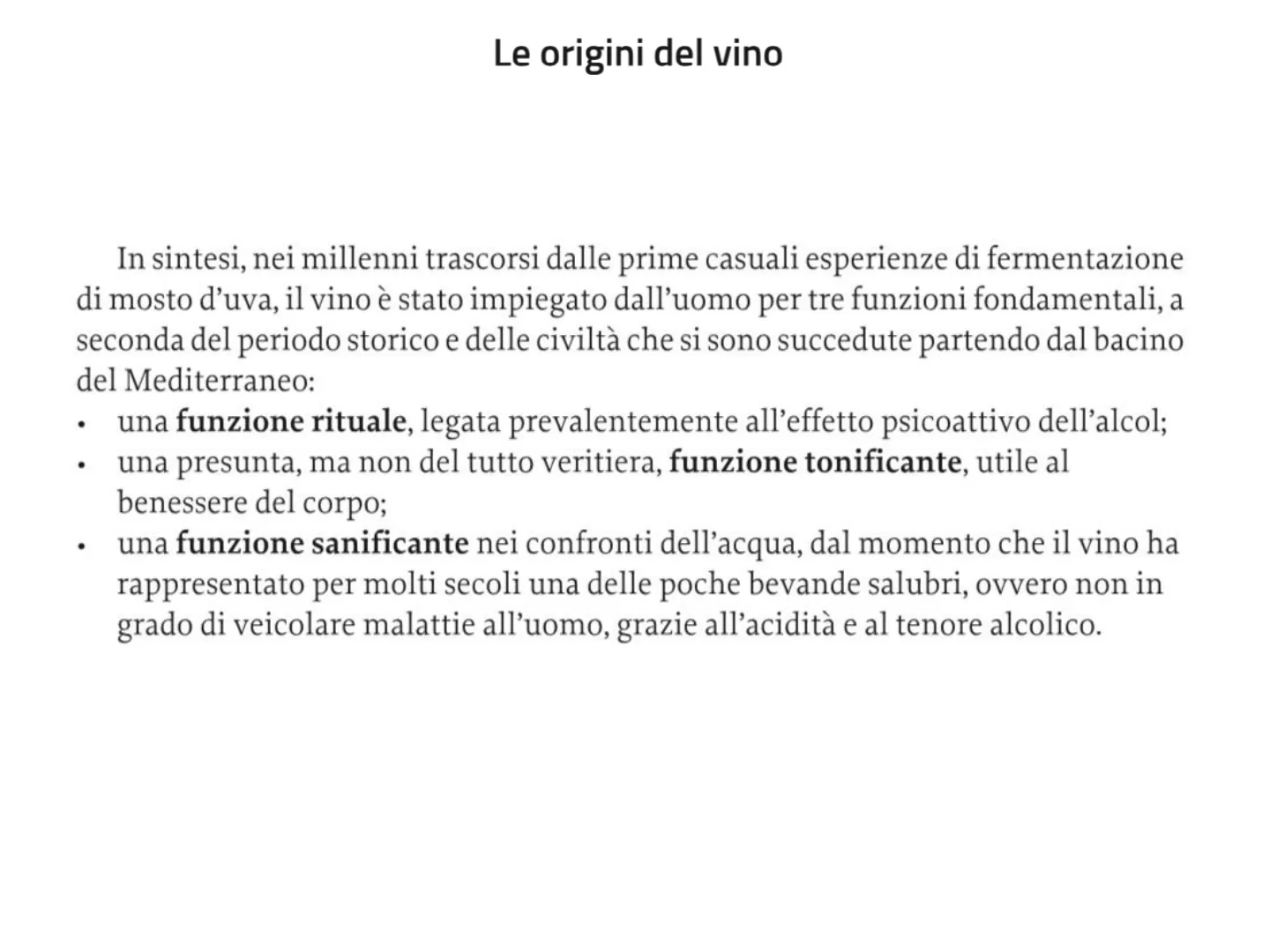 In sintesi, nei millenni trascorsi dalle prime casuali esperienze di fermentazione di mosto d'uva, il vino è stato impiegato dall'uomo per tre funzioni fondamentali, a seconda del periodo storico e delle civiltà che si sono succedute partendo dal bacino del Mediterraneo: