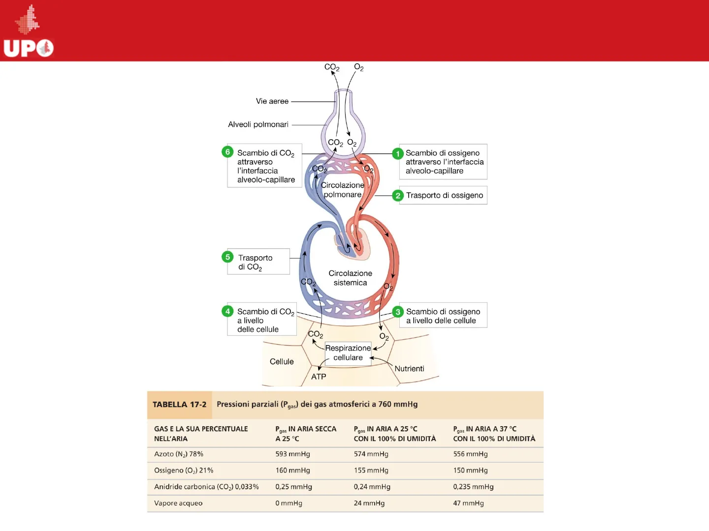 Slide dall'Università del Piemonte Orientale su Fisiologia, Infermieristica. La presentazione, un Pdf di Biologia per l'Università, illustra la meccanica della respirazione e il trasporto di gas, con schemi dettagliati e tabelle sulle pressioni parziali dei gas atmosferici e la regolazione della ventilazione.