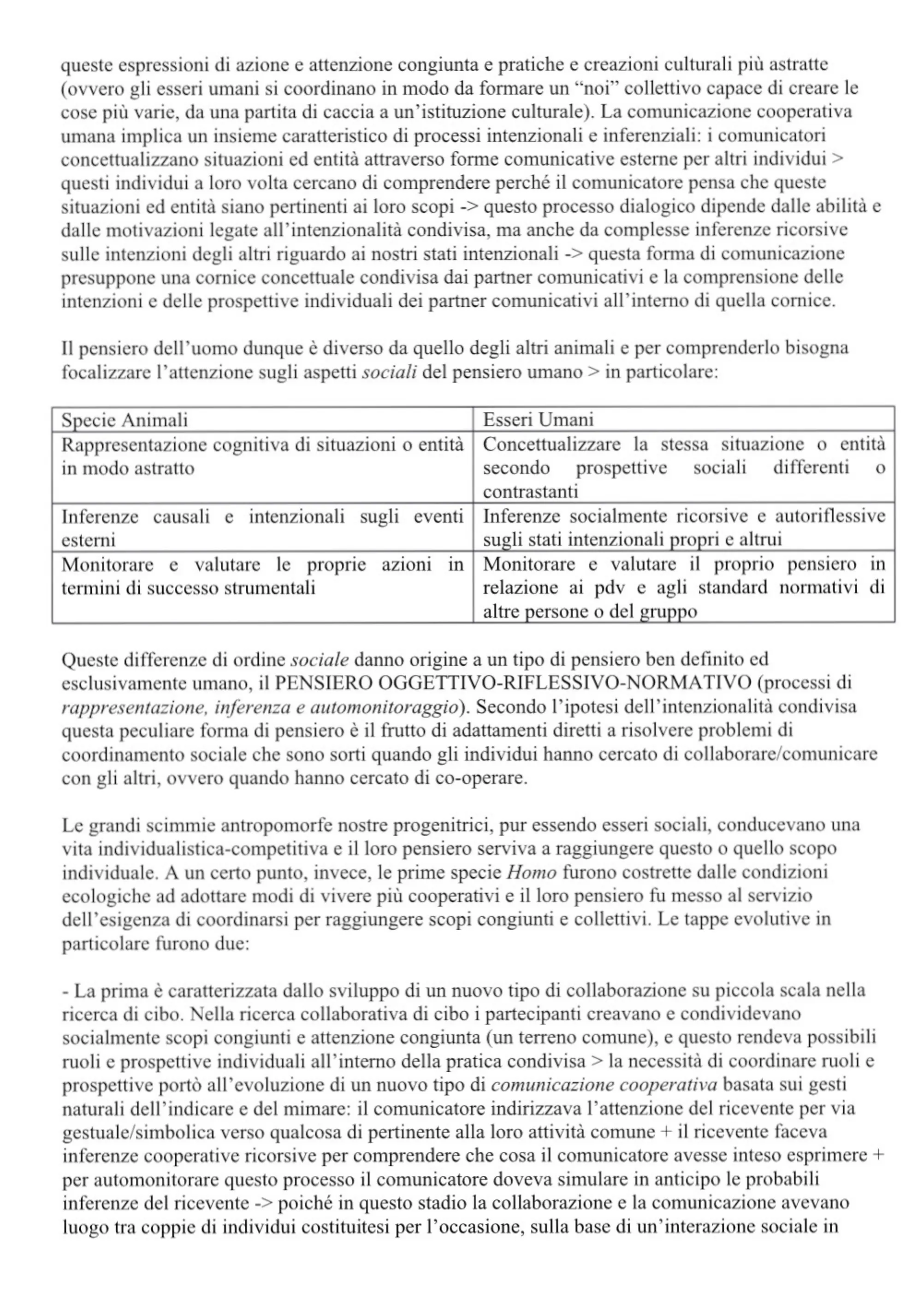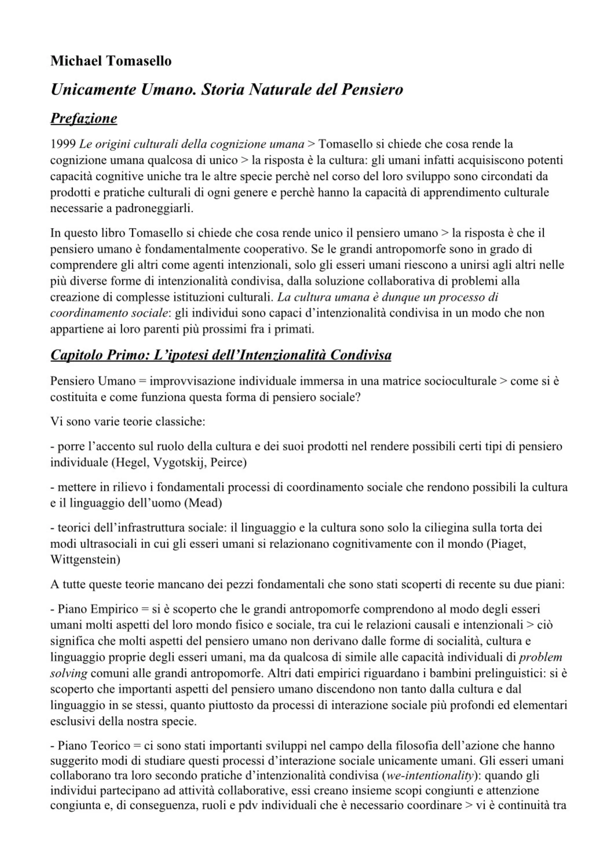 Documento da Università su Unicamente Umano. Storia Naturale del Pensiero. Il Pdf esplora la teoria dell'intenzionalità condivisa di Michael Tomasello, analizzando l'evoluzione del pensiero umano e della comunicazione cooperativa in Psicologia, confrontando umani e grandi antropomorfe.