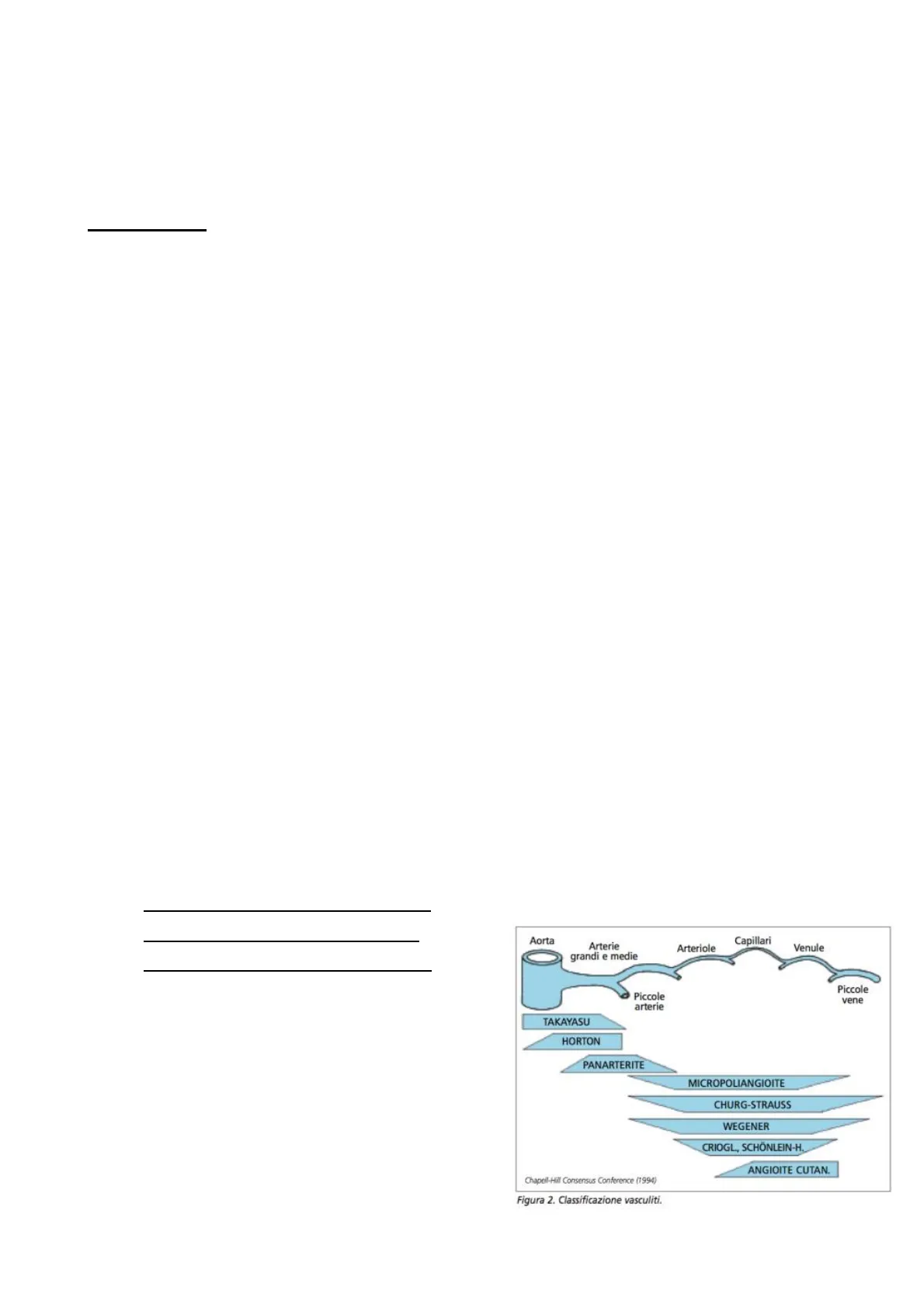 Difficile trovare vasculiti che colpiscono indifferentemente vasi piccoli, medi o grandi. Di solito tendono a colpire vasi con stesse classi di dimensione (NB tecnicamente dovrebbero potersi manifestare in qualunque tipo di vaso ma, praticamente, sono decisamente più frequenti forme del vaso arterioso; è raro che vene di grosso calibro siano oggetto di vasculite). Aorta Capillari Arterie grandi e medie Arteriole Venule Piccole arterie Piccole vene TAKAYASU HORTON PANARTERITE MICROPOLIANGIOITE CHURG-STRAUSS WEGENER CRIOGL., SCHÖNLEIN-H. ANGIOITE CUTAN. Chapel-Hill Consensus Conference (1994) Figura 2. Classificazione vasculiti.