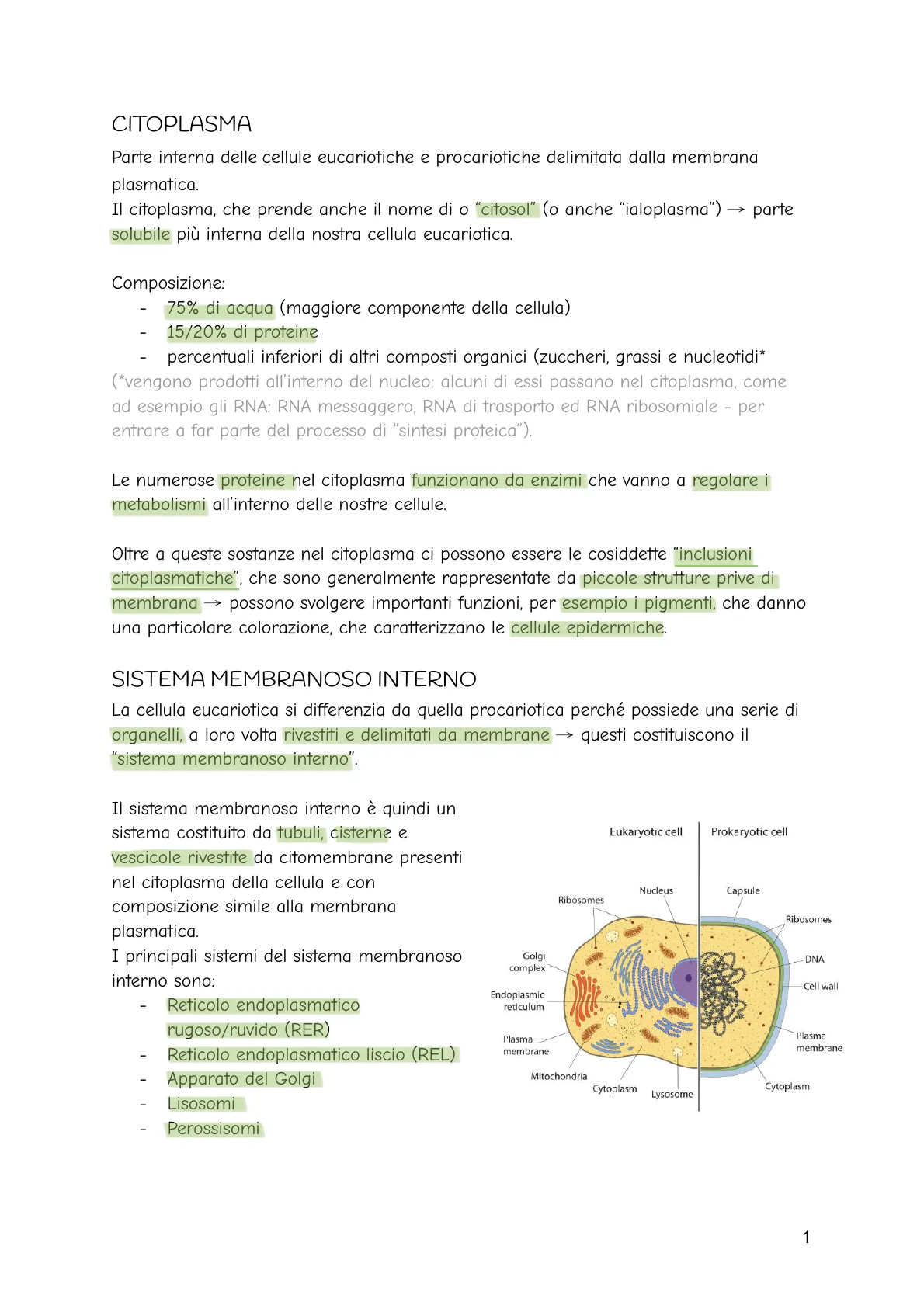 Documento sul citoplasma e il sistema membranoso interno delle cellule eucariotiche. Il Pdf, di Biologia per l'Università, descrive la composizione del citoplasma, le funzioni del reticolo endoplasmatico rugoso e liscio, e le proteine transmembrana.
