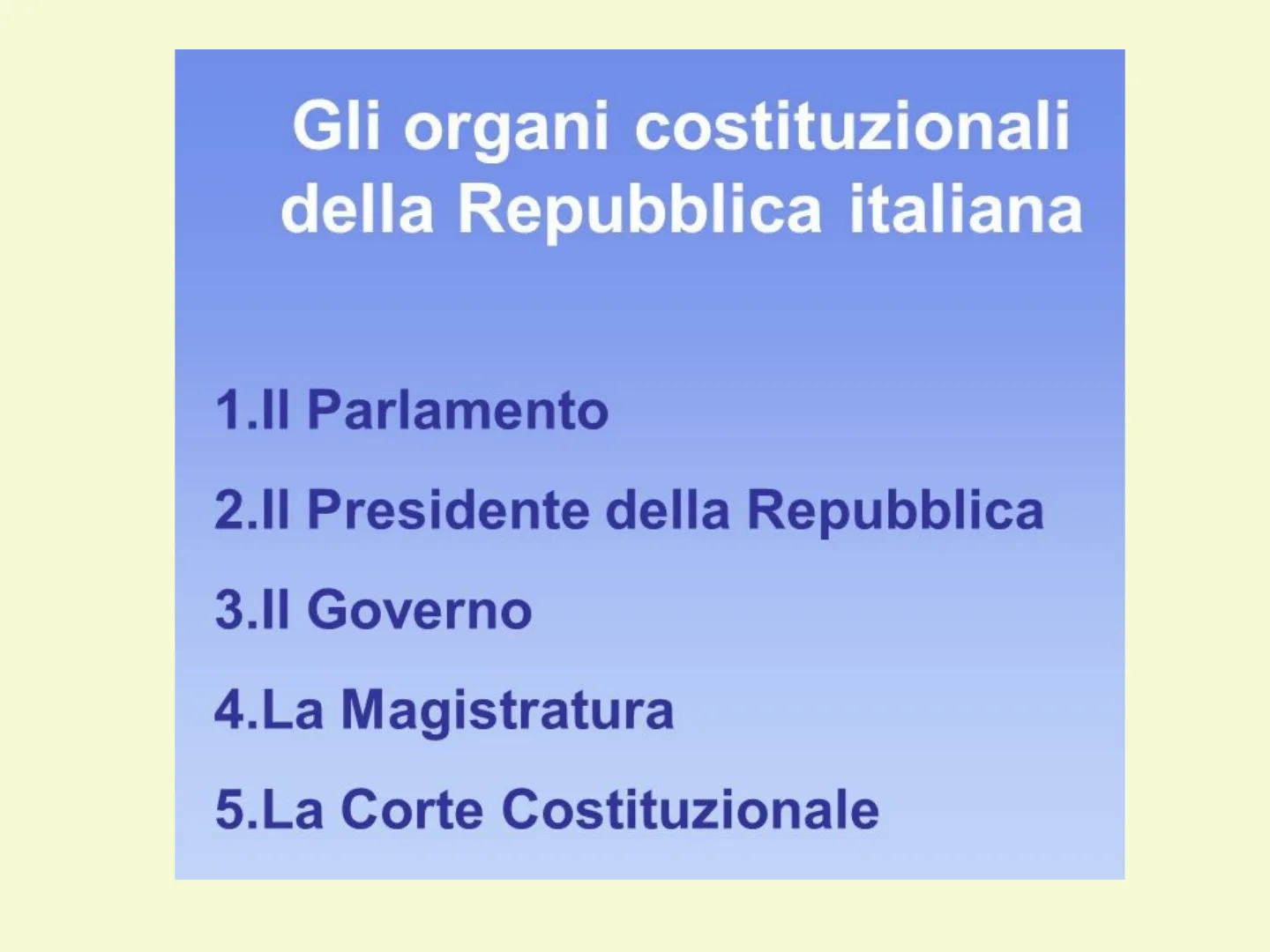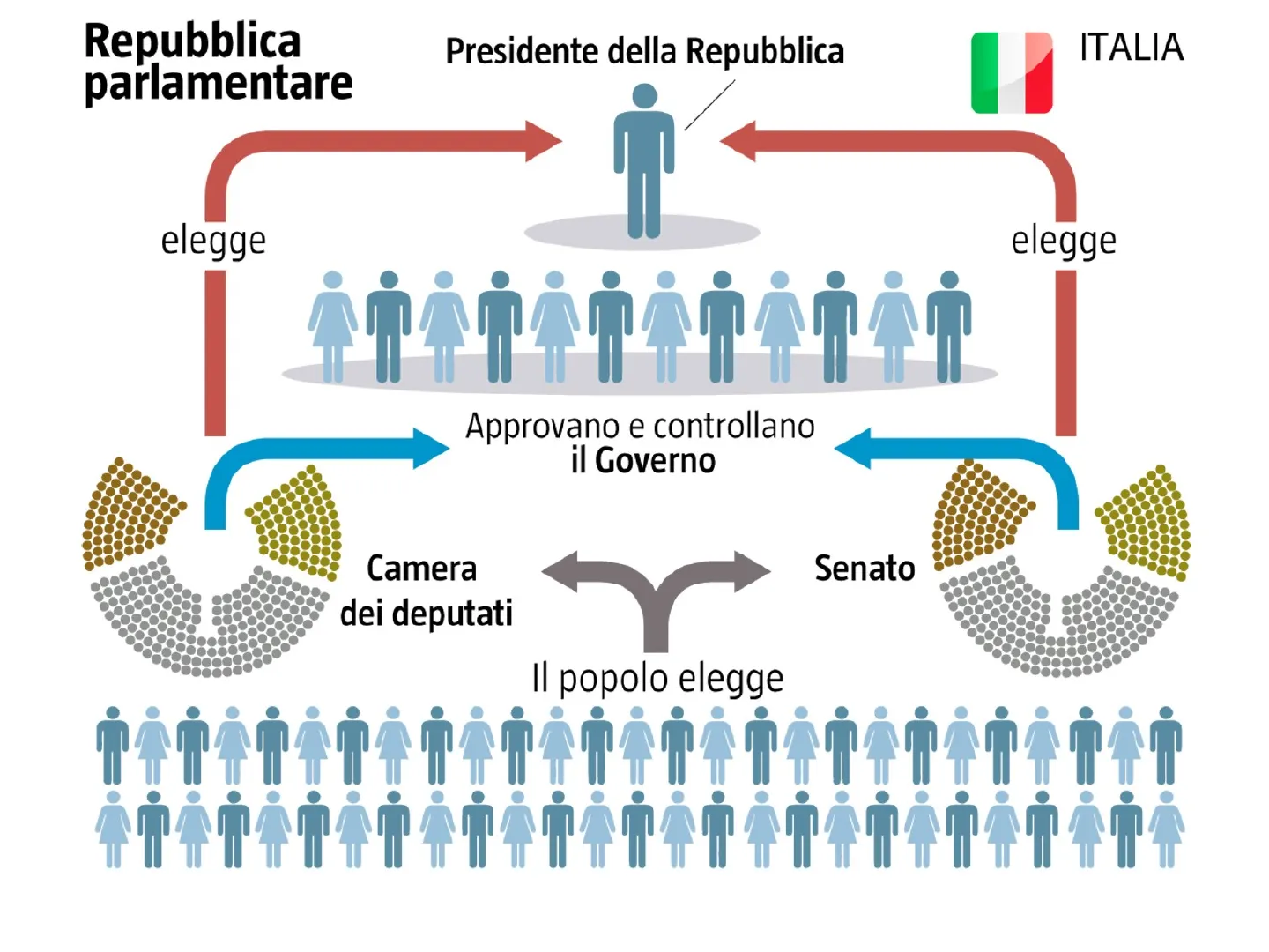 Repubblica parlamentare Presidente della Repubblica ITALIA elegge elegge Approvano e controllano il Governo Camera dei deputati Senato Il popolo eleggeGli organi costituzionali della Repubblica italiana