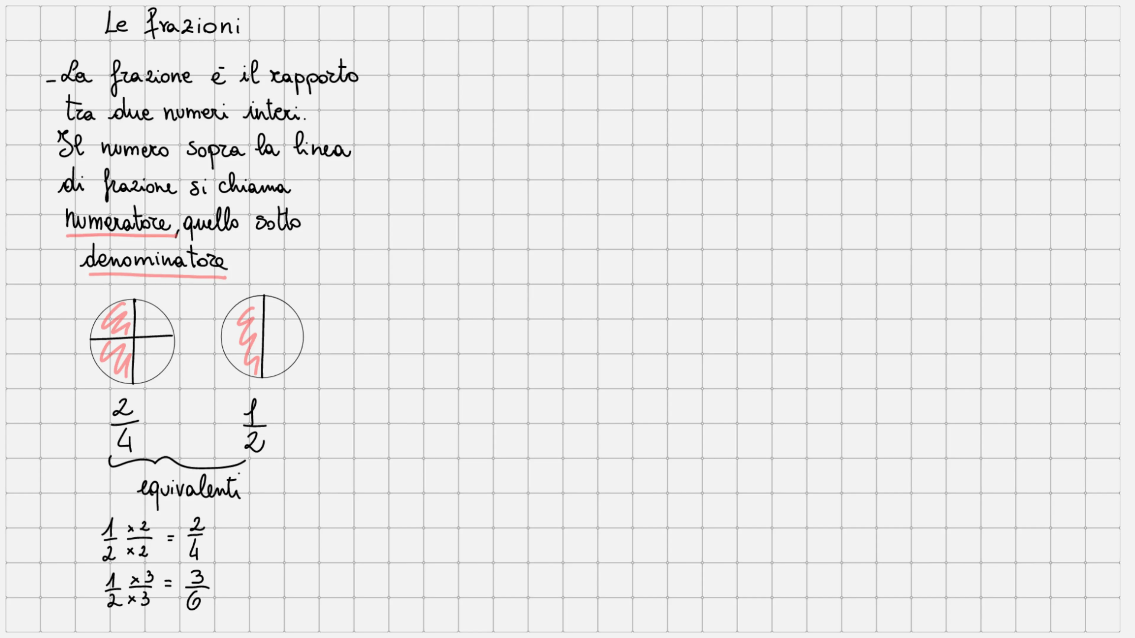 Le frazioni - La frazione è il rapporto tra due numeri interi. Il numero sopra la linea di frazione si chiama numeratore, quello sotto denominatore