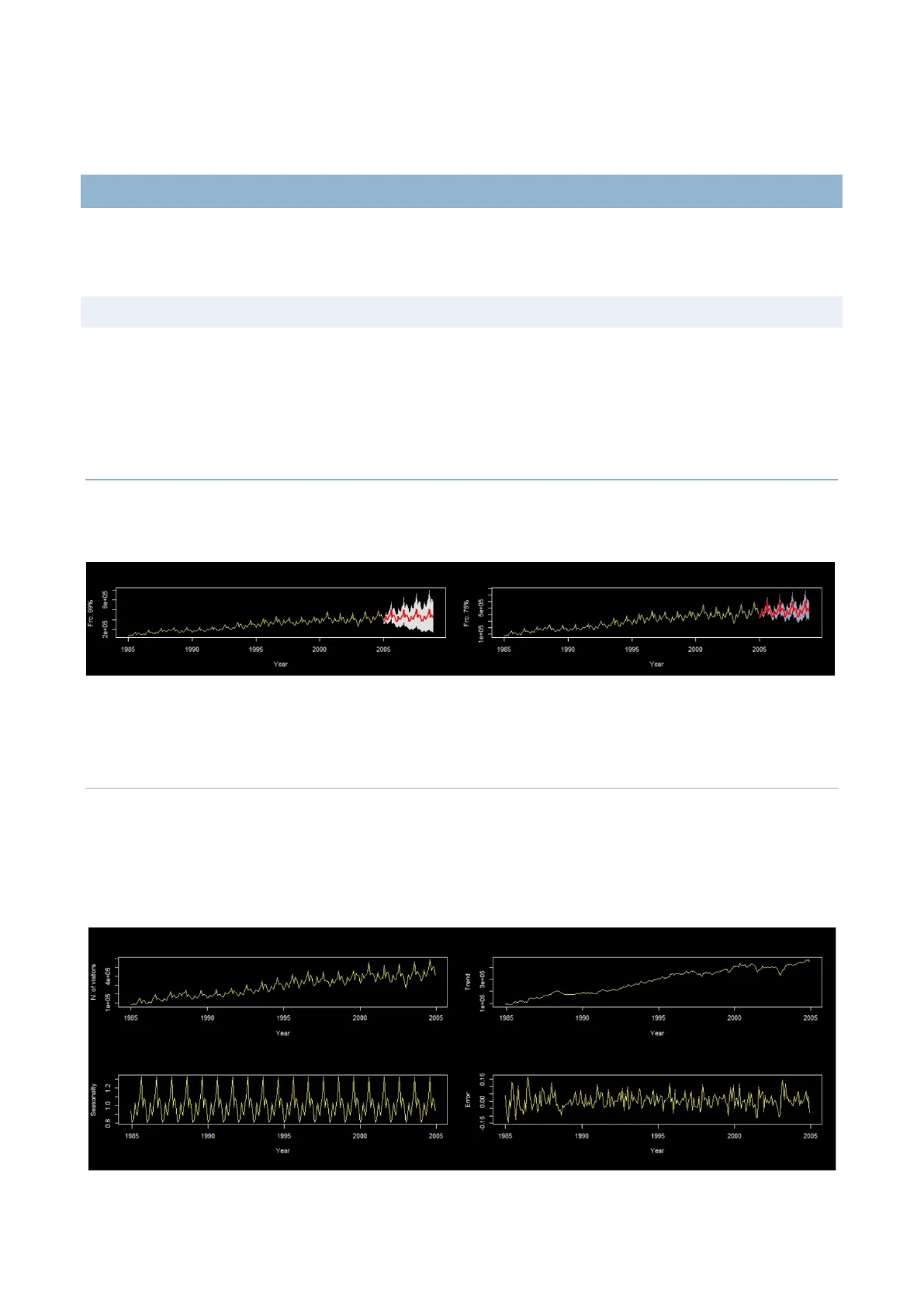 Nei seguenti grafici è rappresentata la medesima serie storica per cui si costruisce una previsione con due intervalli di previsione diversi, uno al 99% e uno al 75%. Frc. 99% 2e+05 8e+05 Frc. 75% 1e+05 5e+05 1985 1990 1995 2000 2005 1985 1990 1995 2000 2005 Year Year In giallo è rappresentata la serie storica, in rosso la previsione e in bianco l'intervallo di previsione, che rappresenta l'incertezza legata alla previsione stessa (più l'intervallo è ampio maggiore sarà la probabilità che la previsione sia corretta).