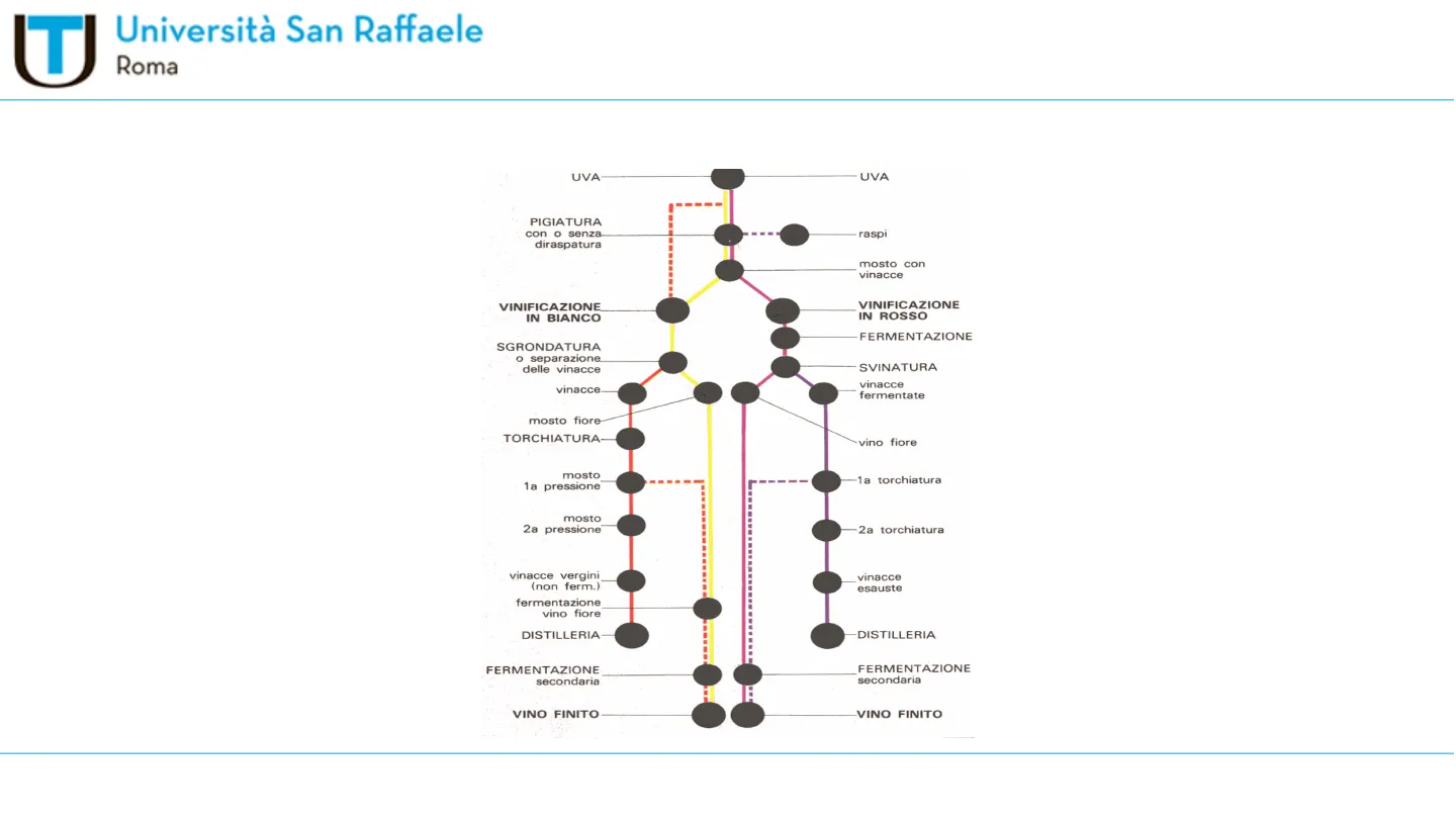 Slide dall'Università San Raffaele su Vino - Processo produttivo - Vinificazione in rosso. Il Pdf illustra i sistemi di vinificazione, i macchinari come la diraspapigiatrice e i diversi tipi di vasche utilizzate, con schemi e immagini a supporto delle spiegazioni.