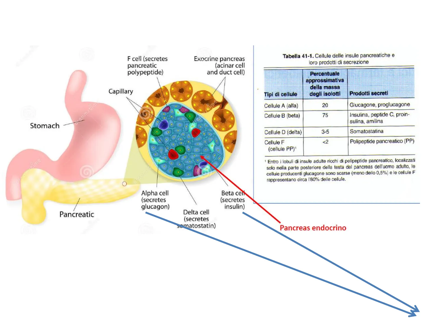 | Cellule F (cellule PP)' | <2 | Polipeptide pancreatico (PP) |
