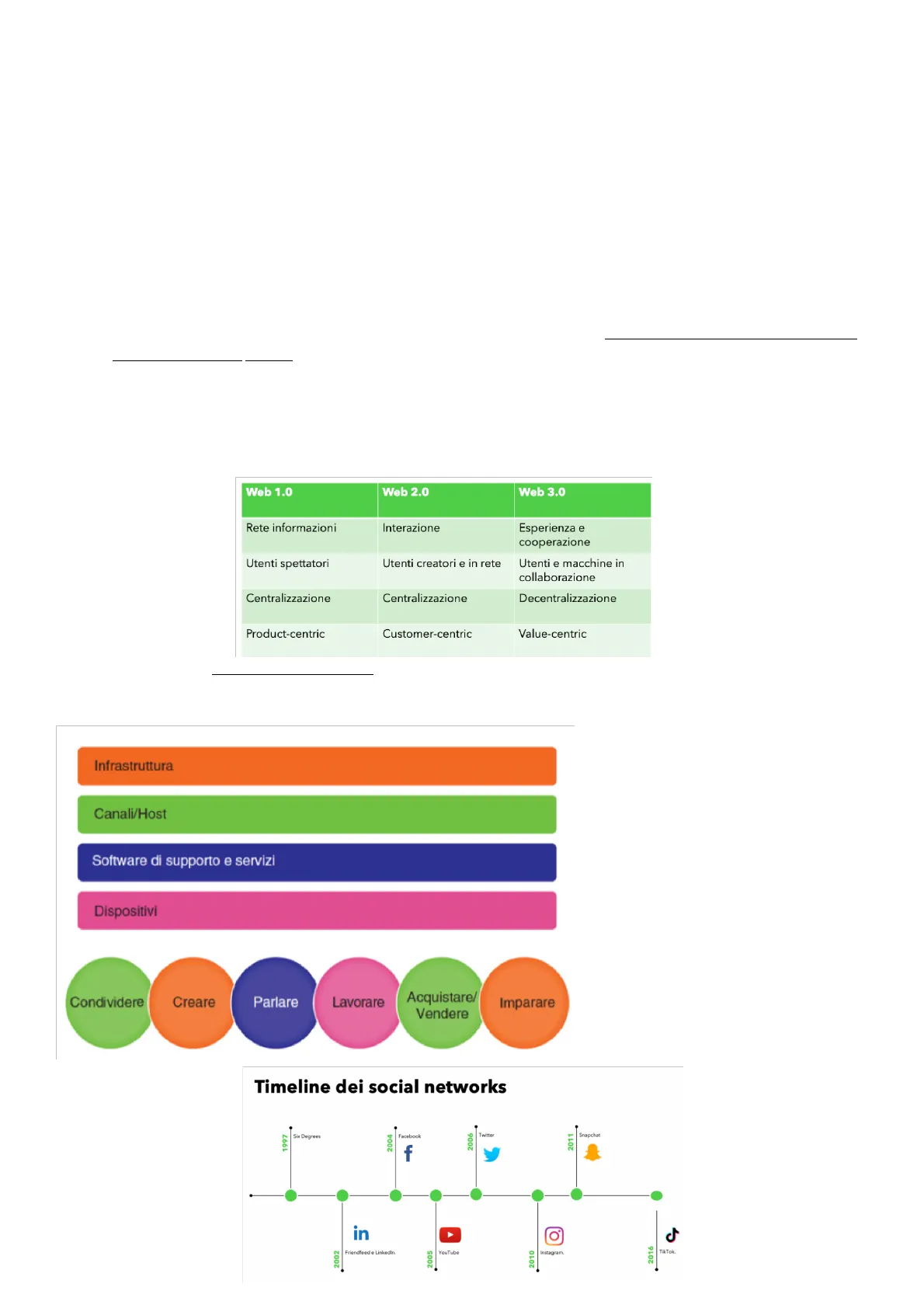 I siti di social network (SNS) = piattaforme online che consentono ai loro membri di creare e gestire profili, individuare altri membri con cui sono connessi, partecipare consumando, producendo e/o interagendo - I profili consentono ai membri di sviluppare un'identità social Forum = versione antica dei social media, focalizzati sulle discussioni tra i membri wiki = spazi collaborativi online che consentono ai membri della comunità di contribuire alla creazione di una risorsa utile e condivisa.