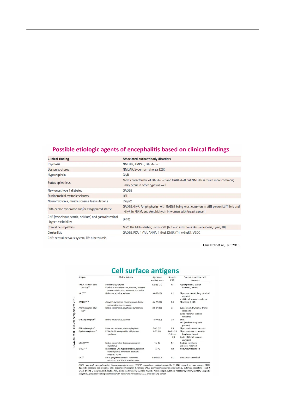 Possible etiologic agents of encephalitis based on clinical findings Clinical finding Associated autoantibody disorders Psychosis NMDAR, AMPAR, GABA-B-R Dystonia, chorea NMDAR, Sydenham chorea, D2R Hyperekplexia GlyR Status epilepticus Most characteristic of GABA-B-R and GABA-A-R but NMDAR is much more common; may occur in other types as well New onset type 1 diabetes GAD65 Fasciobrachial dystonic seizures LGI1 Neuromyotonia, muscle spasms, fasciculations Caspr2 Stiff-person syndrome and/or exaggerated startle GAD65, GlyR, Amphiphysin (with GAD65 being most common in stiff person/stiff limb and GlyR in PERM, and Amphiphysin in women with breast cancer) CNS (myoclonus, startle, delirium) and gastrointestinal hyper-excitability DPPX Cranial neuropathies Ma2, Hu, Miller-Fisher, Bickerstaff (but also infections like Sarcoidosis, Lyme, TB) Cerebellitis GAD65, PCA-1 (Yo), ANNA-1 (Hu), DNER (Tr), mGluR1, VGCC CNS: central nervous system, TB: tuberculosis. Lancaster et al., JNC 2016