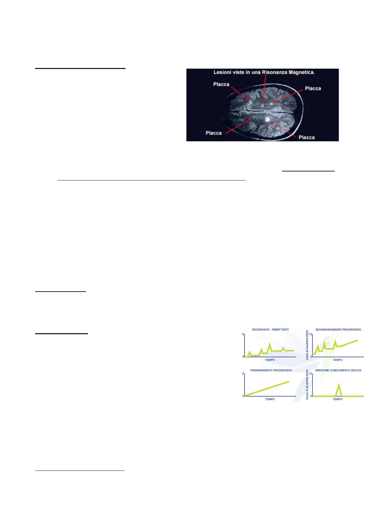 Forme cliniche -> il processo autoimmune colpisce la mielina in punti diversi e in momenti diversi, questo fa si che, a seconda dell'area colpita, il sintomo varierà. Ecco perché nella sclerosi multipla abbiamo tantissimi segni e tantissimi sintomi diversi. La placca1 di demielinizzazione può colpire ovunque e quindi il sintomo di esordio può essere il più disparato, anche l'evoluzione della malattia sarà imprevedibile. La sclerosi multipla si può presentare in molte forme: