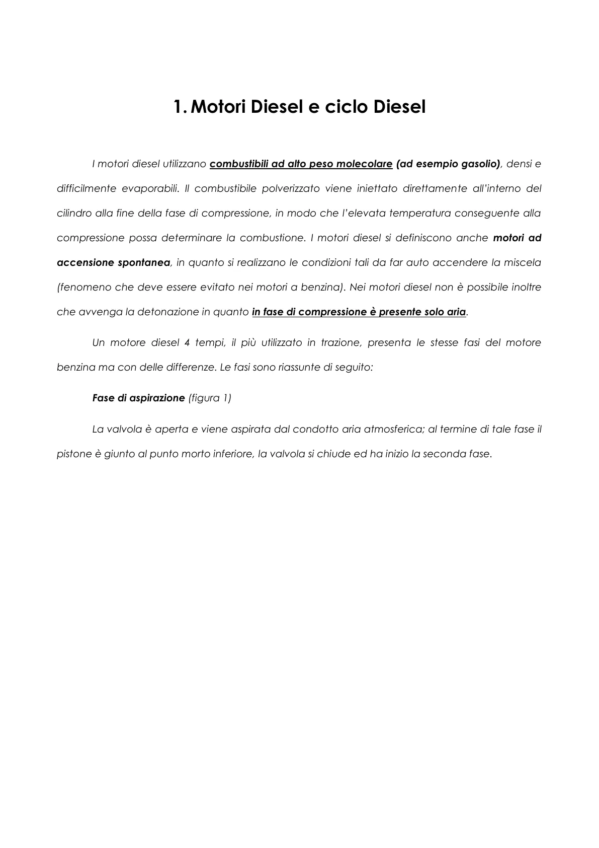 1. Motori Diesel e ciclo Diesel I motori diesel utilizzano combustibili ad alto peso molecolare (ad esempio gasolio), densi e difficilmente evaporabili. Il combustibile polverizzato viene iniettato direttamente all'interno del cilindro alla fine della fase di compressione, in modo che l'elevata temperatura conseguente alla compressione possa determinare la combustione. I motori diesel si definiscono anche motori ad accensione spontanea, in quanto si realizzano le condizioni tali da far auto accendere la miscela (fenomeno che deve essere evitato nei motori a benzina). Nei motori diesel non è possibile inoltre che avvenga la detonazione in quanto in fase di compressione è presente solo aria.