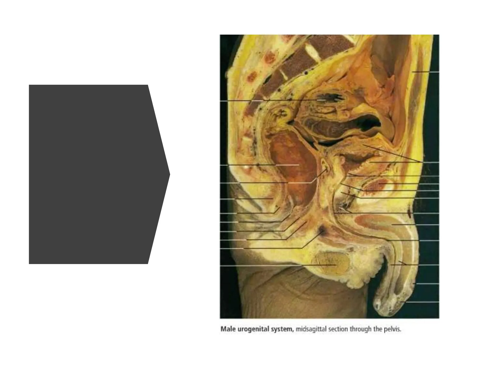 Male urogenital system, midsagittal section through the pelvis.