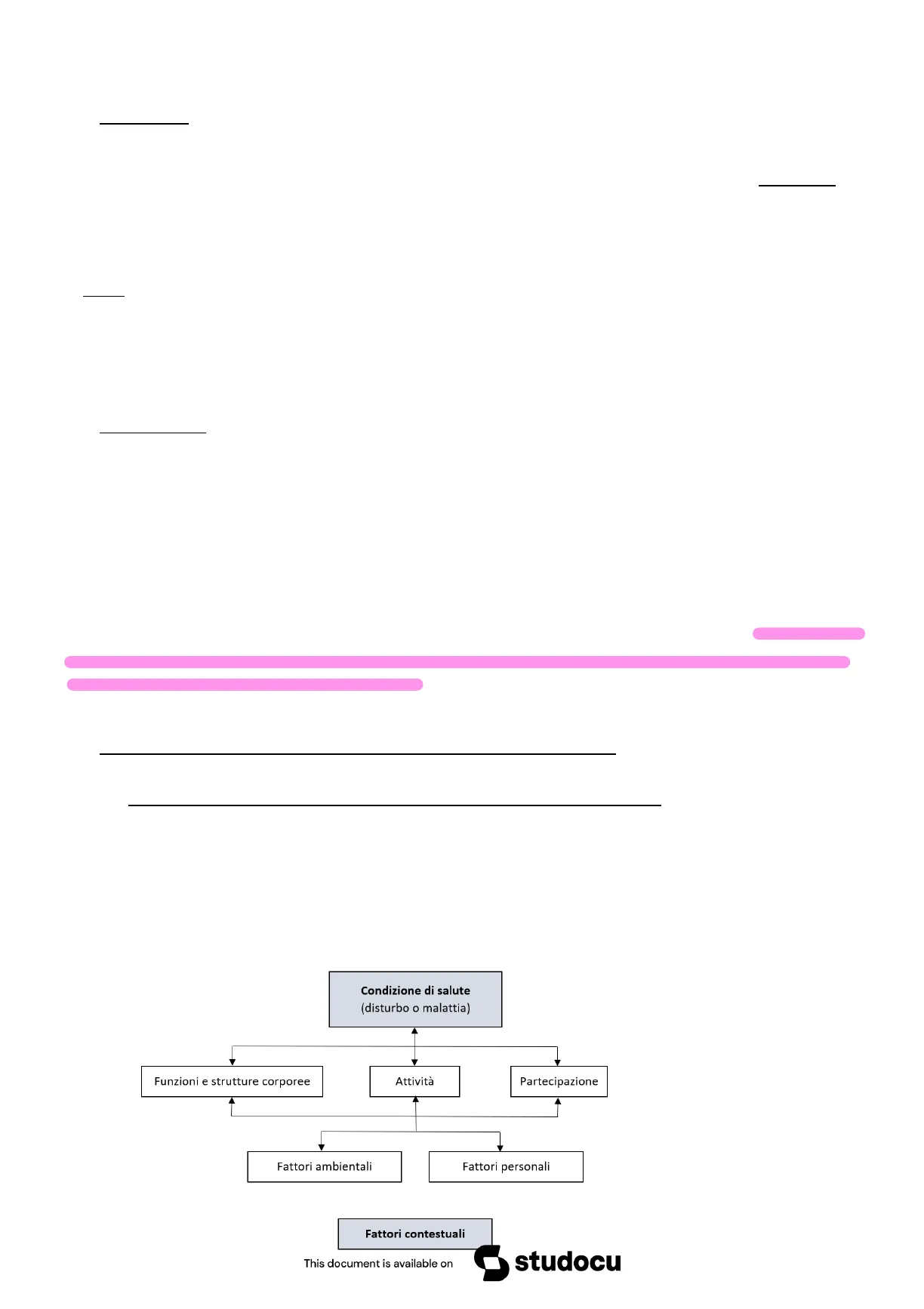 Condizione di salute (disturbo o malattia) Funzioni e strutture corporee Attività Partecipazione Fattori ambientali Fattori personali Le "condizioni di salute" sono un termine che rimanda a malattie, sindromi, ferite o traumi, stress, anomalie congenite o predisposizioni genetiche; nell'ICF sono classificati il funzionamento della persona Fattori contestuali This document is available on studocu Scaricato da Marta Marulli (m.marulli@campus.unimib.it)comprendente le funzioni corporee, le attività e la partecipazione, e la disabilità associata alle condizioni di salute.