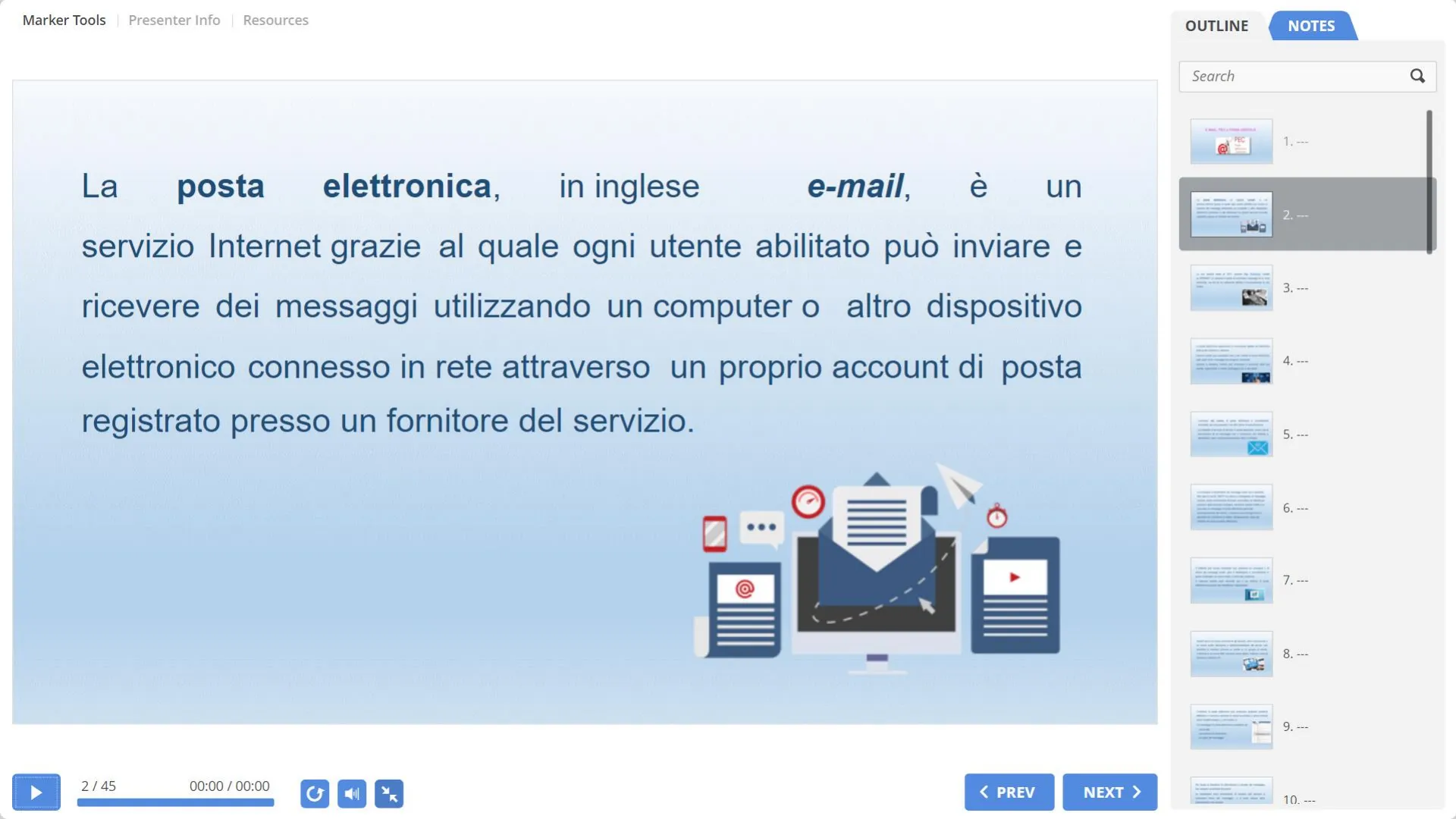 00:00 / 00:00 2 / 45 K < PREV NEXT 10. --- La posta elettronica, in inglese e-mail, è un servizio Internet grazie al quale ogni utente abilitato può inviare e ricevere dei messaggi utilizzando un computer o altro dispositivo elettronico connesso in rete attraverso un proprio account di posta registrato presso un fornitore del servizio. ...Marker Tools Presenter Info Resources OUTLINE NOTES Search a