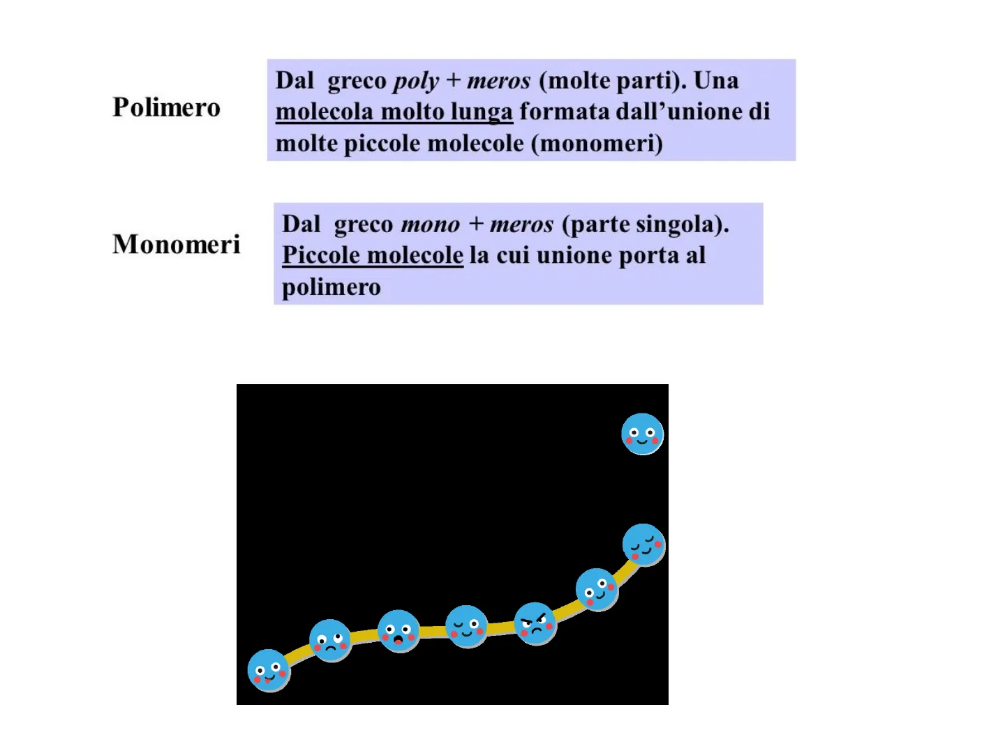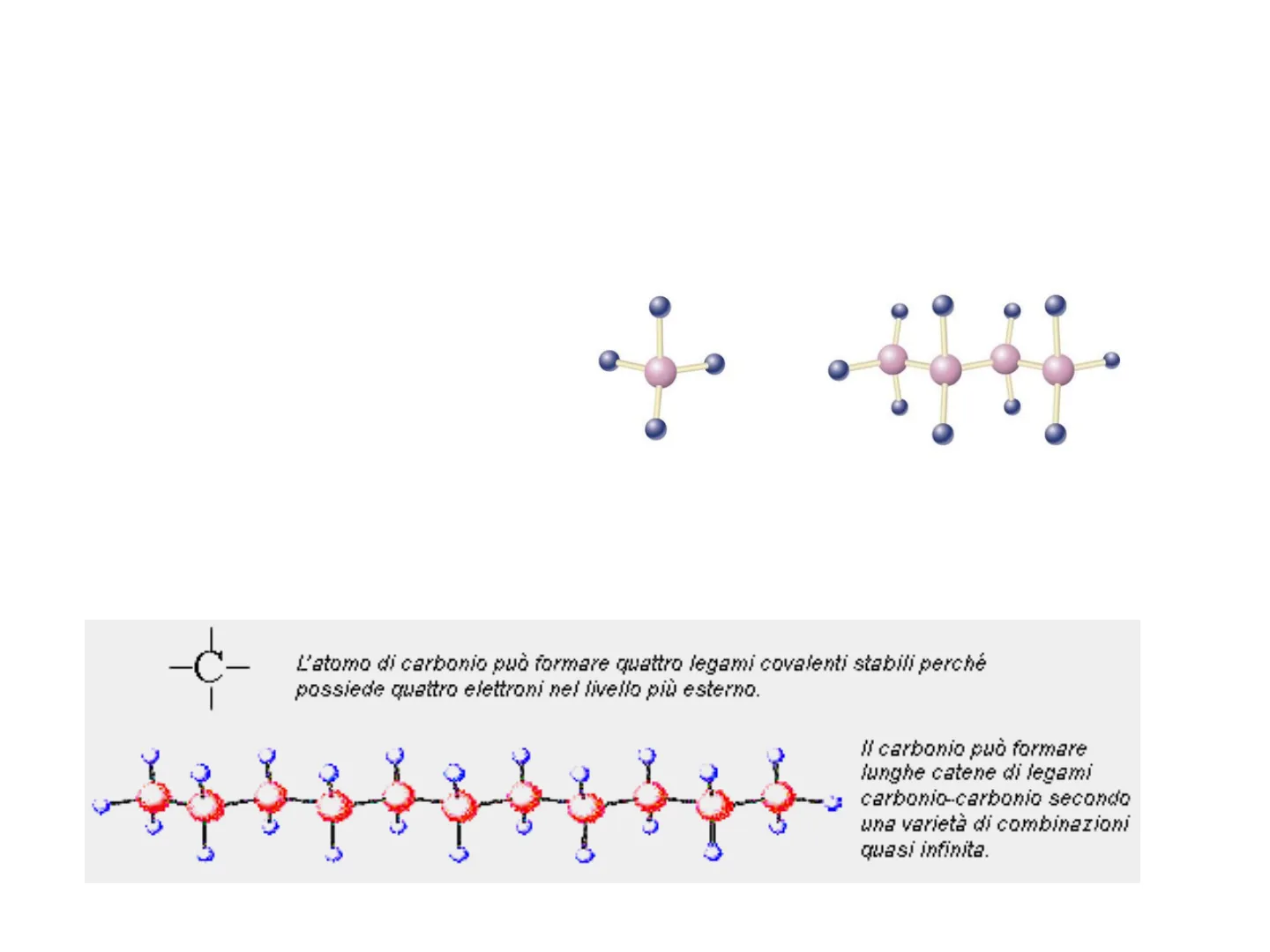 L'atomo di carbonio può formare quattro legami covalenti stabili perché possiede quattro elettroni nel livello più esterno. Il carbonio può formare lunghe catene di legemi carbonio-carbonio secondo una varietà di combinazioni quasi infinita.Polimero Dal greco poly + meros (molte parti). Una molecola molto lunga formata dall'unione di molte piccole molecole (monomeri) Monomeri Dal greco mono + meros (parte singola). Piccole molecole la cui unione porta al polimero