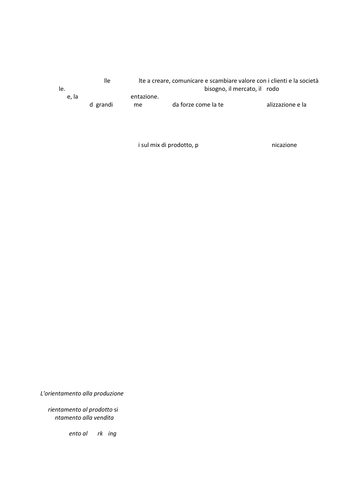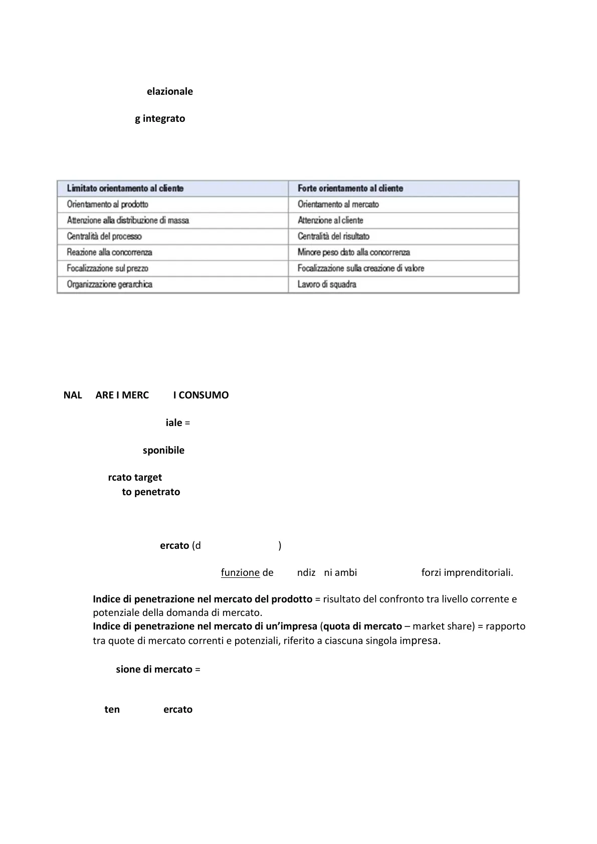 Limitato orientamento al cliente Forte orientamento al cliente Orientamento al prodotto Orientamento al mercato Attenzione alla distribuzione di massa Attenzione al cliente Centralità del processo Centralità del risultato Reazione alla concorrenza Minore peso dato alla concorrenza Focalizzazione sul prezzo Focalizzazione sulla creazione di valore Organizzazione gerarchica Lavoro di squadra Mercato potenziale Addressable market Target market Market share