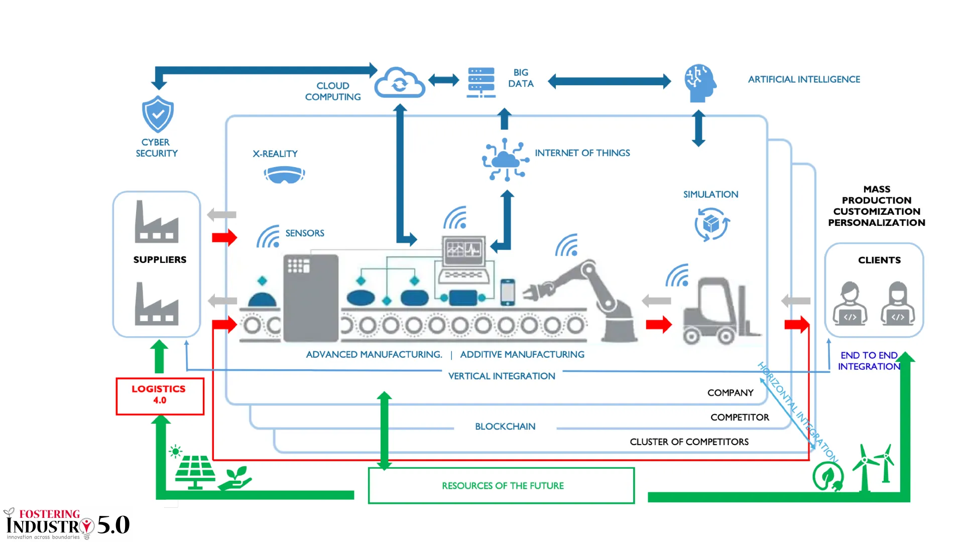 BIG DATA ARTIFICIAL INTELLIGENCE V CYBER SECURITY X-REALITY INTERNET OF THINGS SIMULATION MASS PRODUCTION CUSTOMIZATION PERSONALIZATION SENSORS SUPPLIERS CLIENTS ADVANCED MANUFACTURING. | ADDITIVE MANUFACTURING END TO END INTEGRATION VERTICAL INTEGRATION LOGISTICS 4.0 COMPANY COMPETITOR CLUSTER OF COMPETITORS FOSTERING INDUSTRY innovation across boundaries 5.0 RESOURCES OF THE FUTURE HORIZONTAL INTEGRATION BLOCKCHAIN CLOUD COMPUTING