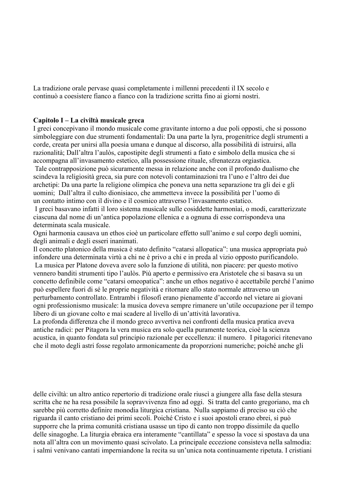 Capitolo I - La civiltà musicale greca I greci concepivano il mondo musicale come gravitante intorno a due poli opposti, che si possono simboleggiare con due strumenti fondamentali: Da una parte la lyra, progenitrice degli strumenti a corde, creata per unirsi alla poesia umana e dunque al discorso, alla possibilità di istruirsi, alla razionalità; Dall'altra l'aulòs, capostipite degli strumenti a fiato e simbolo della musica che si accompagna all'invasamento estetico, alla possessione rituale, sfrenatezza orgiastica. Tale contrapposizione può sicuramente messa in relazione anche con il profondo dualismo che scindeva la religiosità greca, sia pure con notevoli contaminazioni tra l'uno e l'altro dei due archetipi: Da una parte la religione olimpica che poneva una netta separazione tra gli dei e gli uomini; Dall'altra il culto dionisiaco, che ammetteva invece la possibilità per l'uomo di un contatto intimo con il divino e il cosmico attraverso l'invasamento estatico. I greci basavano infatti il loro sistema musicale sulle cosiddette harmoniai, o modi, caratterizzate ciascuna dal nome di un'antica popolazione ellenica e a ognuna di esse corrispondeva una determinata scala musicale. Ogni harmonia causava un ethos cioè un particolare effetto sull'animo e sul corpo degli uomini, degli animali e degli esseri inanimati. Il concetto platonico della musica è stato definito "catarsi allopatica": una musica appropriata può infondere una determinata virtù a chi ne è privo a chi e in preda al vizio opposto purificandolo. La musica per Platone doveva avere solo la funzione di utilità, non piacere: per questo motivo vennero banditi strumenti tipo l'aulòs. Più aperto e permissivo era Aristotele che si basava su un concetto definibile come "catarsi omeopatica" DOVE un ethos negativo è accettabile perché l'animo può espellere fuori di sé le proprie negatività e ritornare allo stato normale attraverso un perturbamento controllato. Entrambi i filosofi erano pienamente d'accordo nel vietare ai giovani ogni professionismo musicale: la musica doveva sempre rimanere un'utile occupazione per il tempo libero di un giovane colto e mai scadere al livello di un'attività lavorativa. La profonda differenza che il mondo greco avvertiva nei confronti della musica pratica aveva antiche radici: per Pitagora la vera musica era solo quella puramente teorica, cioè la scienza acustica, in quanto fondata sul principio razionale per eccellenza: il numero. I pitagorici ritenevano che il moto degli astri fosse regolato armonicamente da proporzioni numeriche; poiché anche gli intervalli musicali erano determinati da simili rapporti matematici, la potenza del numero coordinava in un unico insieme astri e musica.