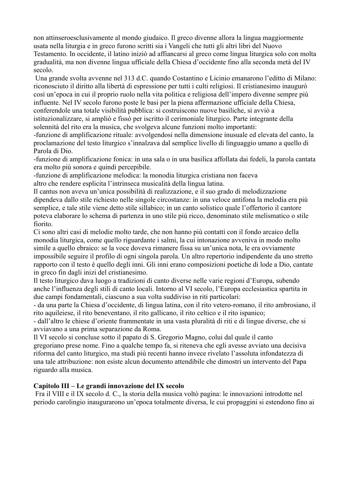Capitolo II - La monodia liturgica cristiana Le musiche greche e romane non fissate per iscritto svanirono gradualmente con lo scomparire delle civiltà: un altro antico repertorio di tradizione orale riuscì a giungere alla fase della stesura scritta che ne ha resa possibile la sopravvivenza fino ad oggi. Si tratta del canto gregoriano, ma che sarebbe più corretto definire monodia liturgica cristiana. Nulla sappiamo di preciso su ciò che riguarda il canto cristiano dei primi secoli. Poiché Cristo e i suoi apostoli erano ebrei, si può supporre che la prima comunità cristiana usasse un tipo di canto non troppo dissimile da quello delle sinagoghe. La liturgia ebraica era interamente "cantillata" e spesso la voce si spostava da una nota all'altra con un movimento quasi scivolato. La principale caratteristica consisteva nella salmodia: i salmi venivano cantati imperniandone la recita su un'unica nota continuamente ripetuta. I cristianinon attinseroesclusivamente al mondo giudaico. Il greco divenne allora la lingua maggiormente usata nella liturgia e in greco furono scritti sia i Vangeli che tutti gli altri libri del Nuovo Testamento. In occidente, il latino iniziò ad affiancarsi al greco come lingua liturgica solo con molta gradualità, ma non divenne lingua ufficiale della Chiesa d'occidente fino alla seconda metà del IV secolo.