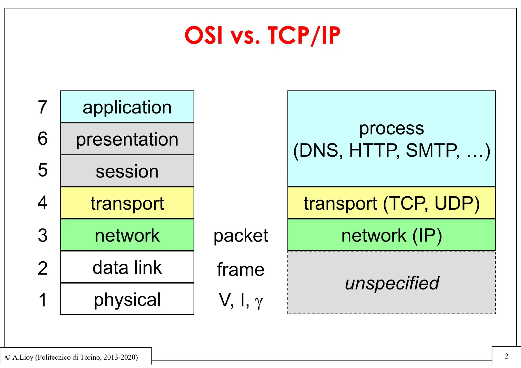 7 application 6 presentation 5 session 4 transport transport (TCP, UDP) 3 network packet network (IP) 2 1 data link frame V, I, Y unspecified physical process (DNS, HTTP, SMTP, ... ) C A.Lioy (Politecnico di Torino, 2013-2020)