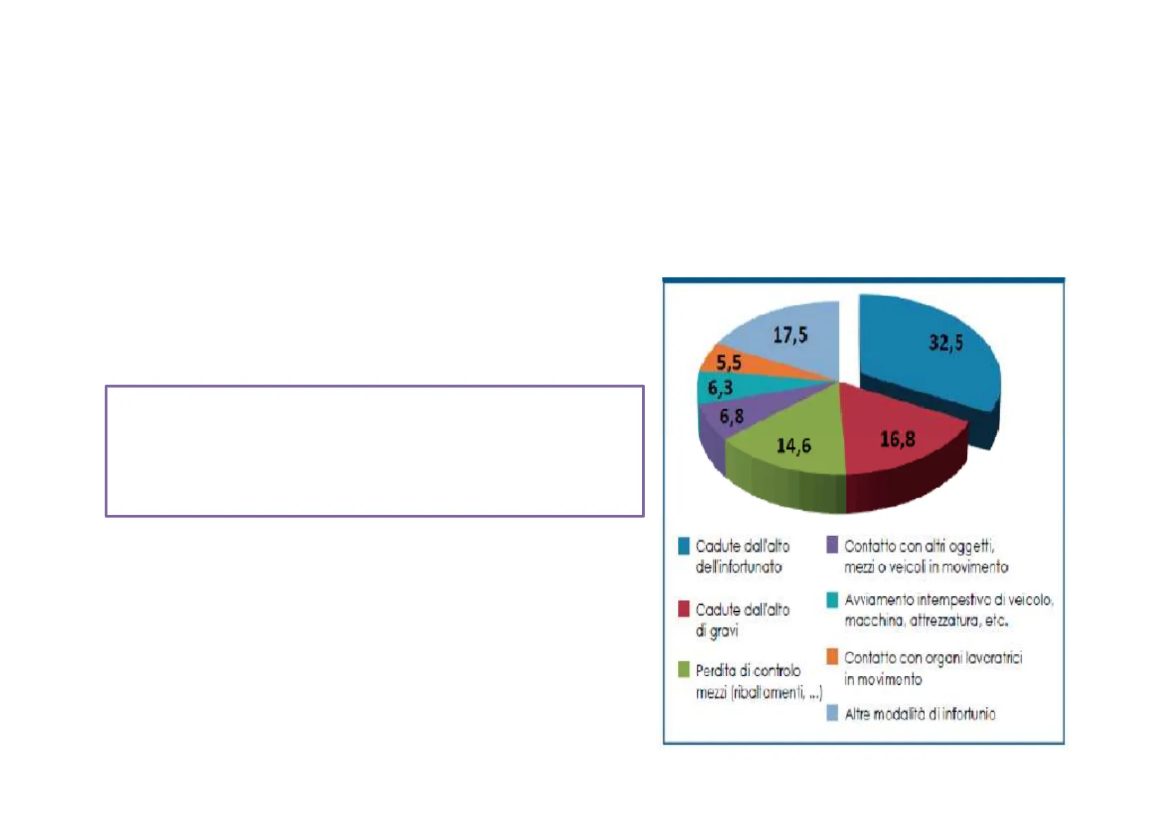 17,5 32,5 5,5 6,3 6,8 16,8 14,6 Cadute dall'alto dell'infortunato Contatto con altri oggetti, mezzi o veicoli in movimento Cadute dall'alto di gravi Avviamento intempestiva di veicolo, macchina, attrezzatura, etc. Perdita di controlo mezzi [ribaltamenti, .. ) Contatto con organi lavoratrici in movimento Altre modalità diinfortunioEsempi di lavori in quota: