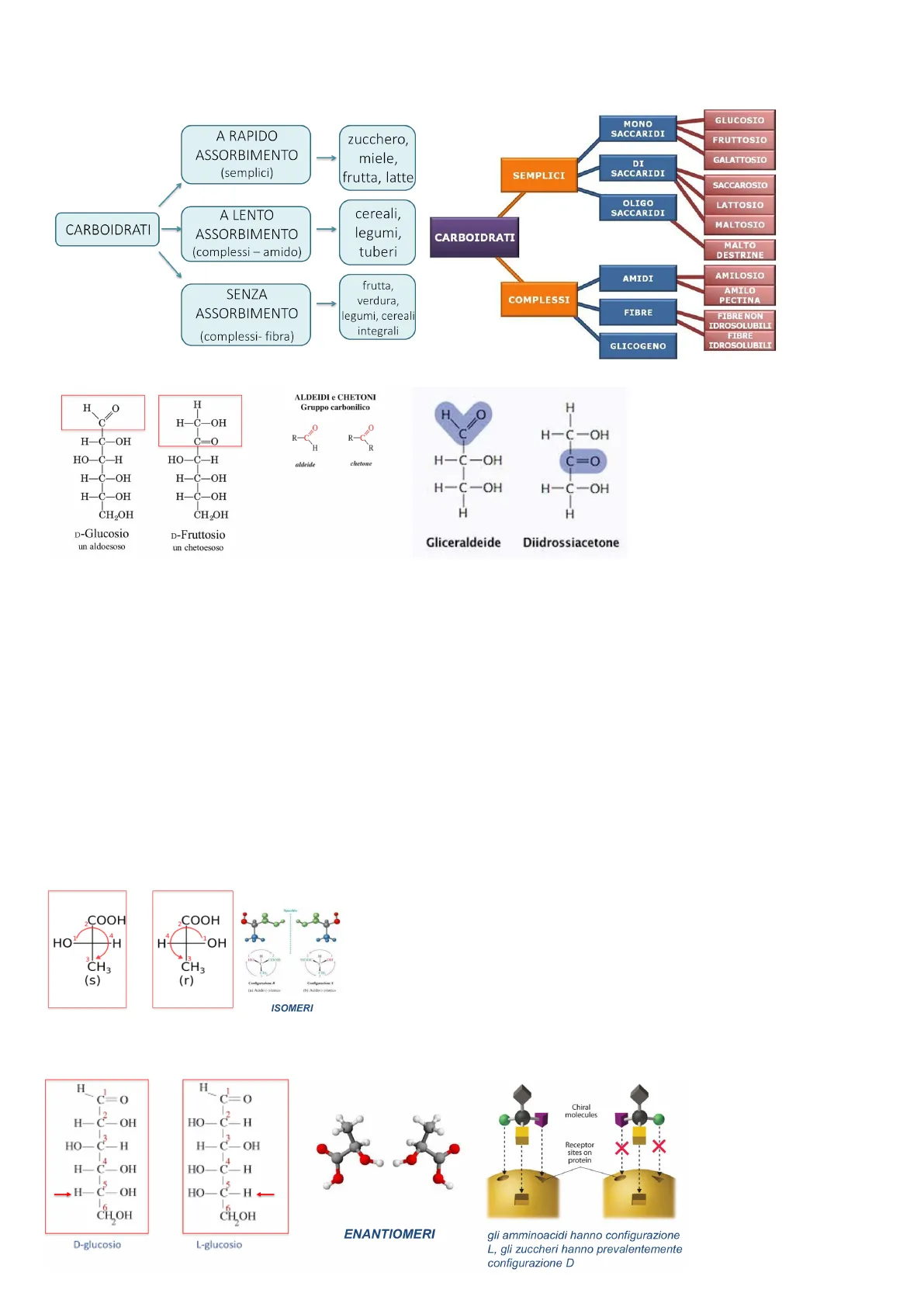 · In base all'isomeria: Isomeri: sono composti diversi che hanno la stessa formula molecolare; gli isomeri strutturali sono caratterizzati da una diversa concatenazione degli atomi; gli stereoisomeri hanno stessa concatenazione degli atomi, ma diversa orientazione degli stessi nello spazio. Stereoisomeri: si suddividono in enantiomeri e diastereoisomeri; gli enantiomeri sono stereoisomeri le cui molecole sono l'una l'immagine speculare e non sovrapponibile dell'altra; i diastereoisomeri sono coppie di stereoisomeri che non sono immagini speculari; gli epimeri sono diastereoisomeri che differiscono per la configurazione presso un solo stereocentro. Configurazione assoluta (R, S):