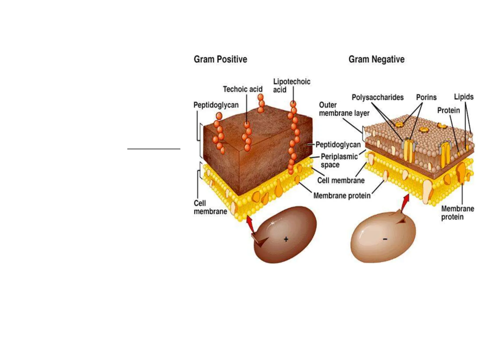 Pili o fimbrie: strutture cave con funzione di migliorare l'adesione dei batteri al substrato o di favorire il passaggio di materiale genetico durante la ricombinazione batterica (pili sessuali).STRUTTURA DELLA PARETE CELLULARE La parete cellulare dei batteri è rigida, posta sopra la membrana cellulare, da forma al battere e ha funzione di regolazione dell'assorbimento idrico; è costituita da diverse sostanze tra queste quella presente in modo significativo è il peptidoglicano. Questa molecola se presente in notevole quantità (> del 10%), forma uno spesso strato sopra la membrana cellulare. Se la quantità di peptidoglicano è inferiore al 10%, lo strato soprastante la membrana cellulare si riduce e su di esso si forma una struttura simile alla membrana cellulare indicata come membrana esterna.