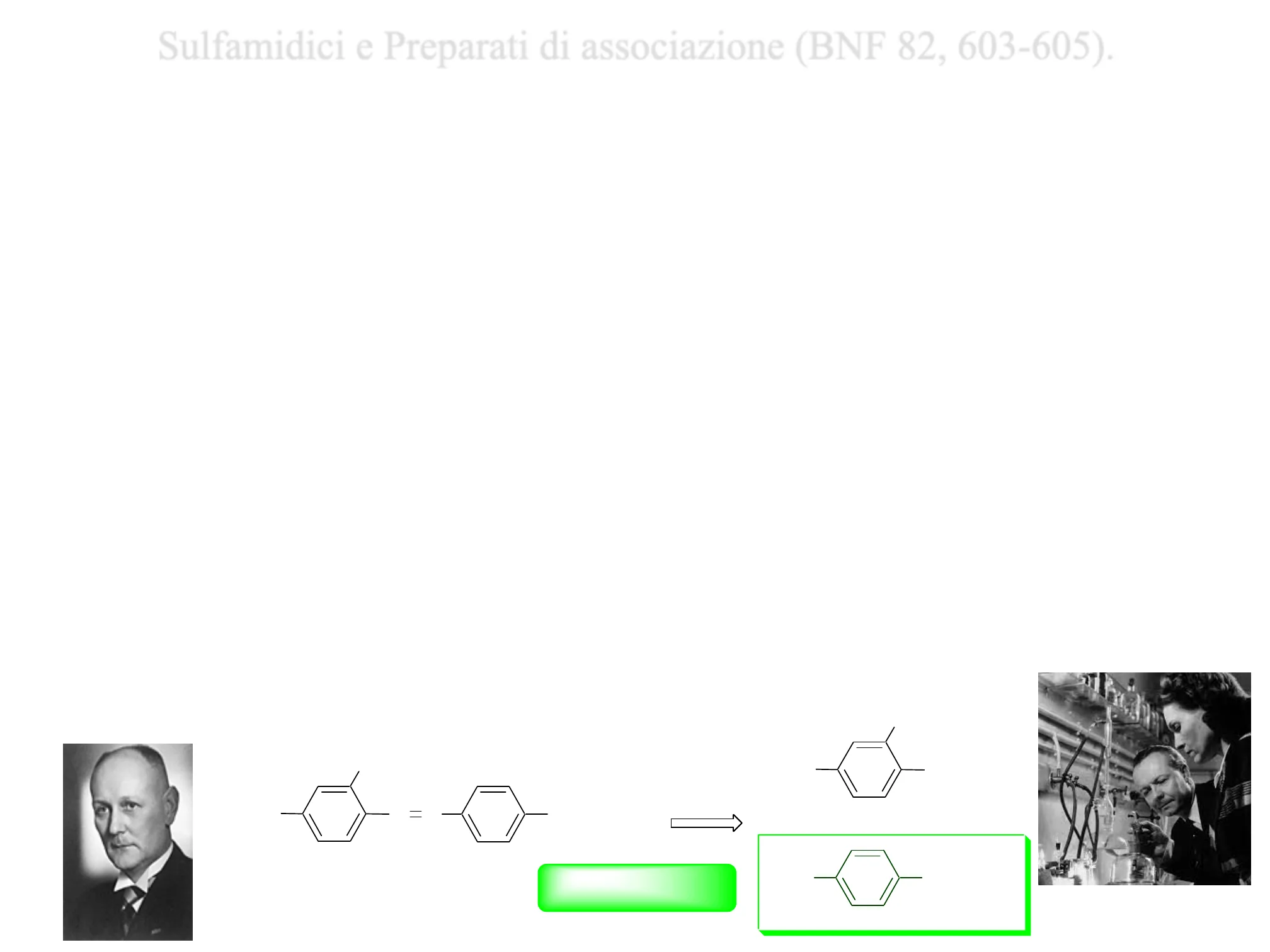 Agli inizi del XX secolo P. Ehrlich evidenziava che diversi coloranti azoici erano efficaci nelle tripanosomiasi sperimentali nel topo. Più tardi, agli inizi degli anni 30 Gerhard Domagk, alla Bayer in Germania, saggiò gli stessi coloranti in infezioni streptococciche al fine di individuare nuovi prototipi ad attività antibatterica. Uno di questi, il prontosil rubrum, mostrò sorprendenti risultati nelle infezioni streptococciche murine. L'attività in vivo non fu tuttavia confermata in vitro. Jaques e Thérése Trèfouel e coll. suggerirono che la marcata attività in vivo in assenza di azione in vitro fosse attribuibile ad una biotrasformazione metabolica del prontosil.