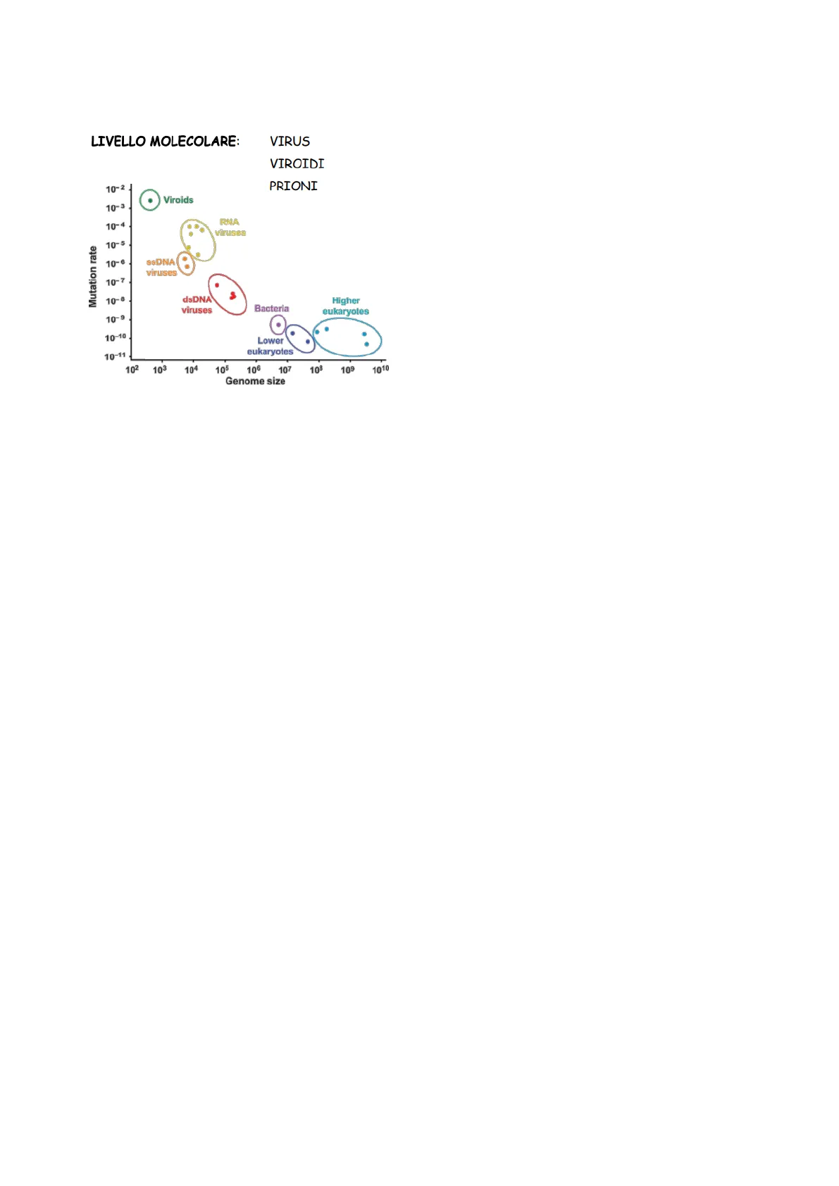VIRUS VIROIDI PRIONI 10-2 Viroids 10-3 10-4 RNA viruses 10-5 Mutation rate 10-6 SSDNA viruses 10-7 10-8 dsDNA viruses Bacteria Higher eukaryotes 10-9 10-10 Lower eukaryotes 10-11. 102 103 104 105 106 107 108 109 1010 Genome size