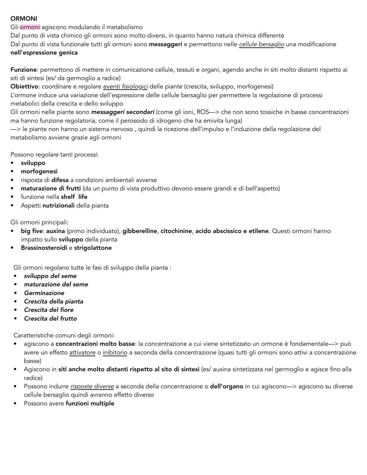 Gli ormoni agiscono modulando il metabolismo Dal punto di vista chimico gli ormoni sono molto diversi, in quanto hanno natura chimica differente Dal punto di vista funzionale tutti gli ormoni sono messaggeri e permettono nelle cellule bersaglio una modificazione nell'espressione genica Funzione: permettono di mettere in comunicazione cellule, tessuti e organi, agendo anche in siti molto distanti rispetto ai siti di sintesi (es/ da germoglio a radice) Obiettivo: coordinare e regolare eventi fisiologici delle piante (crescita, sviluppo, morfogenesi) L'ormone induce una variazione dell'espressione delle cellule bersaglio per permettere la regolazione di processi metabolici della crescita e dello sviluppo Gli ormoni nelle piante sono messaggeri secondari (come gli ioni, ROS-> che non sono tossiche in basse concentrazioni ma hanno funzione regolatoria, come il perossido di idrogeno che ha emivita lunga) -> le piante non hanno un sistema nervoso , quindi la ricezione dell'impulso e l'induzione della regolazione del metabolismo avviene grazie agli ormoni