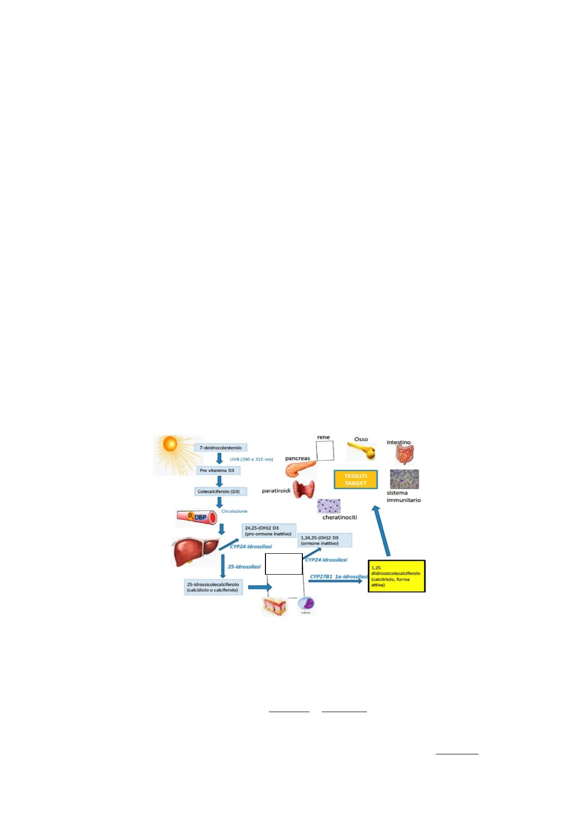 CICLO DELLA VITAMINA D rene Osso intestino 7-deidrocolesterolo UVB (290 e 315 nm) pancreas Pre vitamina D3 TESSUTI TARGET Colecalciferolo (D3) paratiroidi sistema immunitario Circolazione DA DBP cheratinociti 24,25-(OH)2 D3 (pro-ormone inattivo) 1,24,25-(OH)2 D3 (ormone inattivo) CYP24 idrossilasi CYP24 idrossilasi 25-idrossilasi RENE CYP27B1 1a-idrossilasi 1.25 diidrossicolecalciferolo (calcitriolo, forma attiva) 25-idrossicolecalciferolo (calcidiolo o calciferolo) Il ciclo della vitamina D parte dall'esposizione solare, se non c'è un'adeguata esposizione solare, non si può attivare tutto il ciclo. Nel nostro organismo abbiamo una molecola, il 7-deidrocolesterolo, che grazie ai raggi ultravioletti, in particolar modo gli UVB, diventa Pre Vitamina D3, per poi diventare vitamina D3 o anche detta Colecalciferolo (D3). Il colecalciferolo va in circolo, arriva a livello epatico, e qui farà la sua prima idrossilazione e diventa 25-idrossicolecalciferolo (anche detta calcidiolo o calciferolo), quindi è un ormone, una vitamina D che ha un'idrossilazione, che poi è quello che viene misurato dagli esami del sangue (25-OH-vitamina D). C'è poi una seconda idrossilazione, a livello del rene, dove diventerà a questo punto la forma attiva, ovvero, sarà 1,25-diidrossicolecalciferolo, quindi idrossilato sul punto 1 e sul punto 25, anche detta calcitriolo, che sarebbe la vitamina D attiva.È importante conoscere queste fasi, perché noi abbiamo diverse tipologie di supplementazione:
