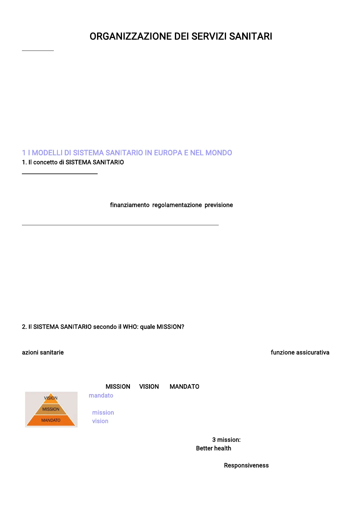 ⚠ Inoltre, il WHO definisce la MISSION, la VISION e il MANDATO VISION Il mandato è la ragione d'essere di un'organizzazione (il dovere), chi lavora per il mamdato è un organizzazione piatta. MISSION La mission è come vuoi fare il mandato (i tuoi principi) MANDATO La vision è la progettualità futura dell'organizzazione ⚠