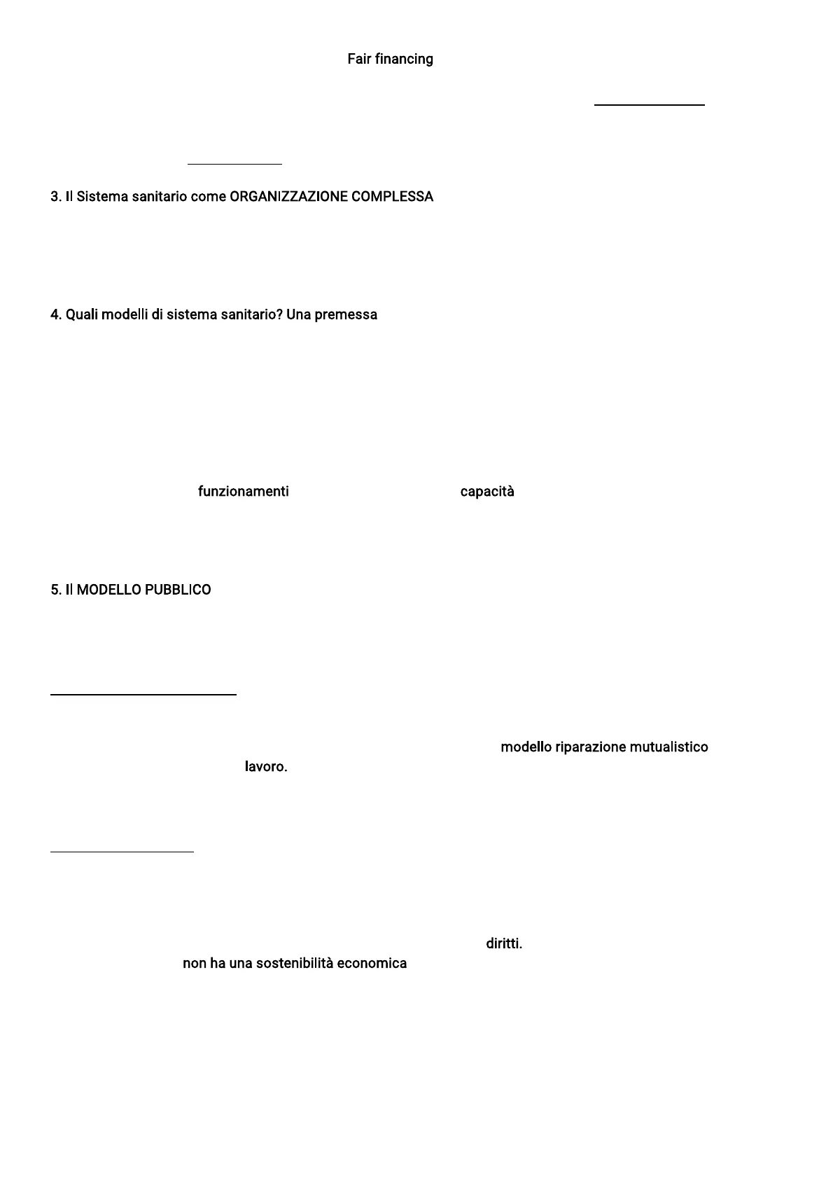 Nel mondo industrializzato l'intervento pubblico in sanità può esprimersi in numerosissime rappresentazioni e i risultati in termini di Health care, equità dell'accesso e soddisfacimento del diritto alla salute possono essere conseguiti con diversi tipologie organizzative, nessuna delle quali ha dunque un primato assoluto. Le Prestazioni sanitarie sono rivolte a curare uno stato di malattia con l'intento di pervenire ad un certo livello di salute individuale. I funzionamenti sono dei risultati acquisiti dall'individuo su piani come quello della salute, della nutrizione, della longevità, dell'istruzione. Accanto alla nozione di funzionamenti, Sen propone il concetto di capacità; mentre i primi riflettono le acquisizioni effettive degli individui e sono quindi costitutivi del well-being, le seconde riflettono le acquisizioni potenziali, e sono quindi costitutive della libertà. Ci sono pochi modelli sanitari e sono sostanzialmente 2: pubblico e assicurativo, ne esiste anche uno misto