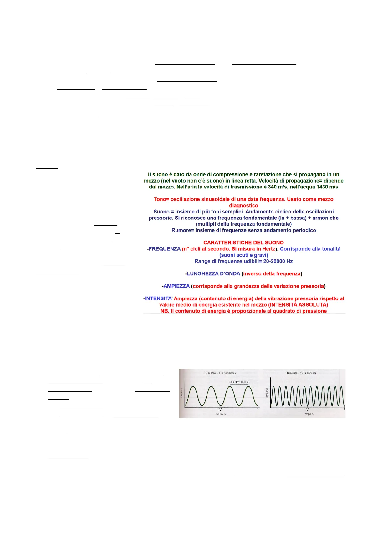 Il suono è dato da onde di compressione e rarefazione che si propagano in un mezzo (nel vuoto non c'è suono) in linea retta. Velocità di propagazione= dipende dal mezzo. Nell'aria la velocità di trasmissione è 340 m/s, nell'acqua 1430 m/s Tono= oscillazione sinusoidale di una data frequenza. Usato come mezzo diagnostico Suono = insieme di più toni semplici. Andamento ciclico delle oscillazioni pressorie. Si riconosce una frequenza fondamentale (la + bassa) + armoniche (multipli della frequenza fondamentale) Rumore= insieme di frequenze senza andamento periodico