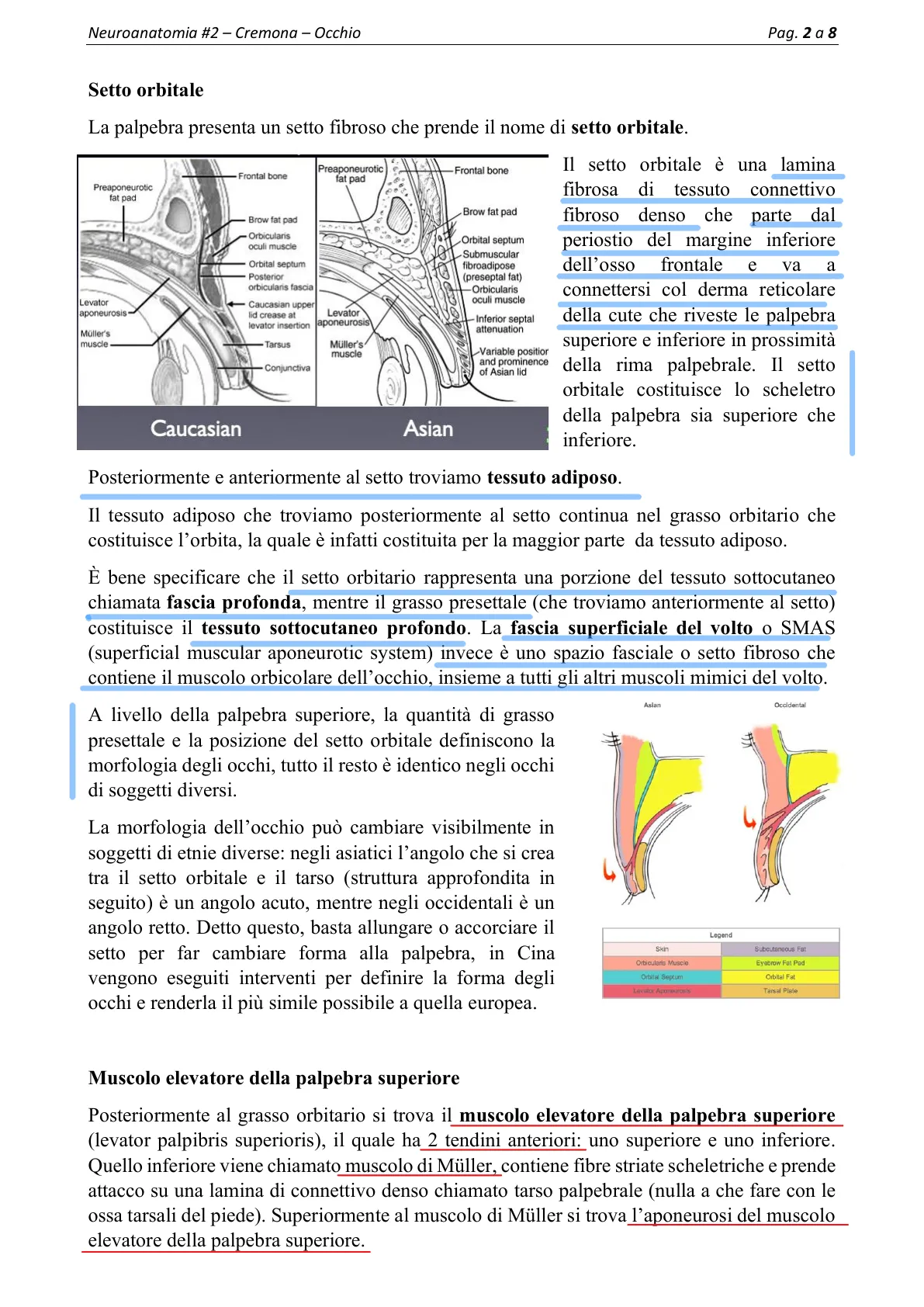 È bene specificare che il setto orbitario rappresenta una porzione del tessuto sottocutaneo chiamata fascia profonda, mentre il grasso presettale (che troviamo anteriormente al setto) costituisce il tessuto sottocutaneo profondo. La fascia superficiale del volto o SMAS (superficial muscular aponeurotic system) invece è uno spazio fasciale o setto fibroso che contiene il muscolo orbicolare dell'occhio, insieme a tutti gli altri muscoli mimici del volto.